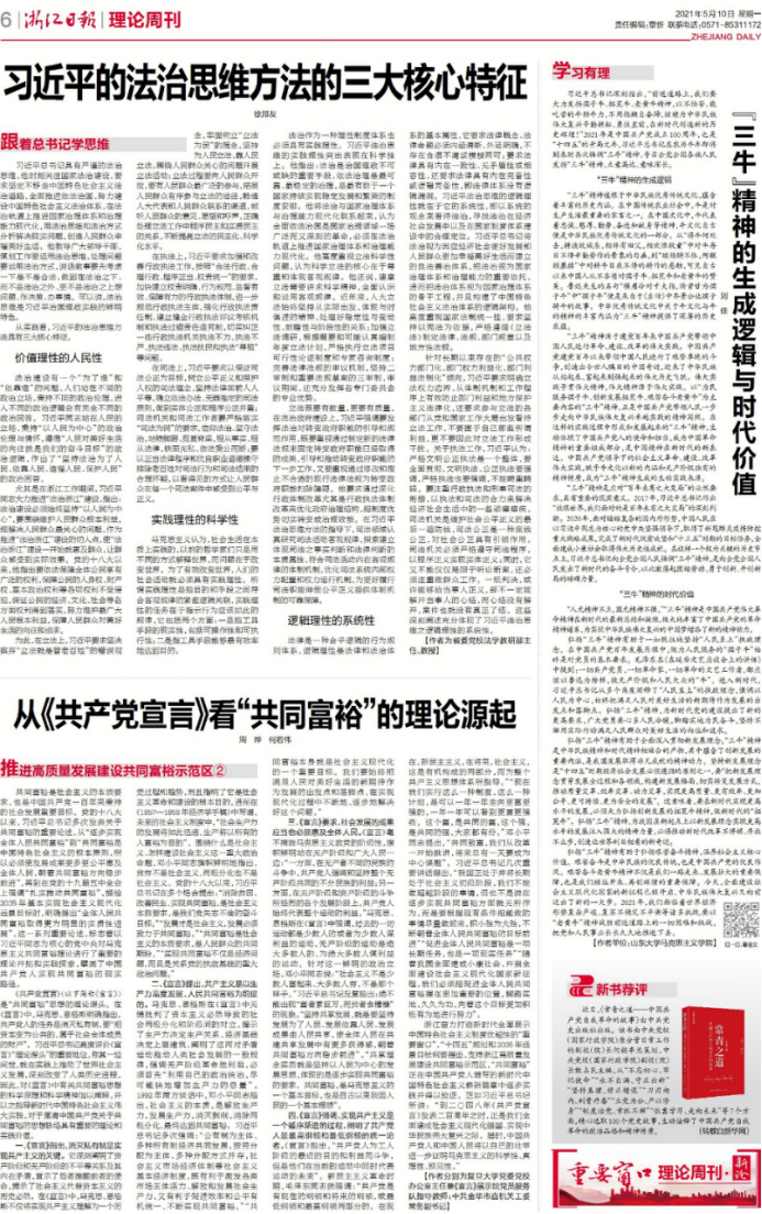 5月10日,《浙江日报》(6版:理论周刊)刊发了我院教师刘佳撰写的理论文章《“三牛”精神的生成逻辑和时代价值》。文章认为,“三牛”精神植根于中华民族优秀传统文化,蕴含着丰富的历史内涵;“三牛”精神源于建党百年来中国共产党带领中国人民进行革命、建设、改革的伟大实践;“三牛”精神是应对“百年未有之大变局”的必然要求,具有重要的现实意义。新时代,弘扬“三牛”精神有助于一如既往地坚持“人民至上”执政理念,有助于全面深入贯彻新发展理念,有助于弘扬艰苦奋斗精神,涵养社会主义核心价值。“三牛”精神是中国共产党伟大革命精神在新时代的最新总结和凝练,极大地丰富了中国共产党的革命精神谱系,为实现中华民族伟大复兴的中国梦增添了新的精神动力。