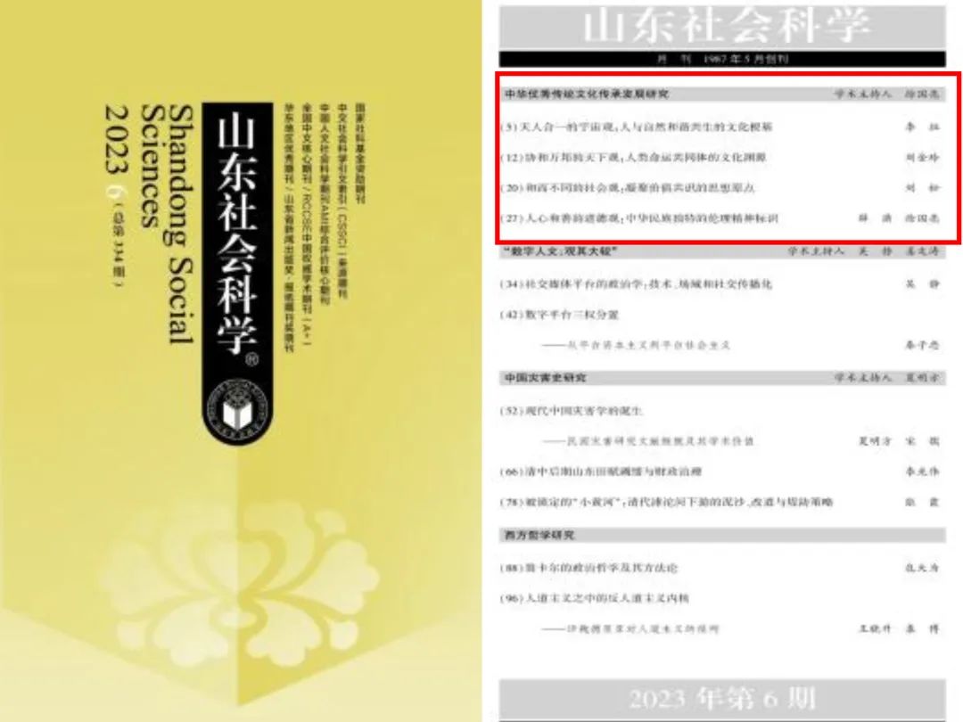 在《山东社会科学》推出系列学术文章。徐国亮教授作为首席专家主持《山东社会科学》第6期“中华优秀传统文化传承发展研究”栏目,发表系列学术文章。文章共四篇,分别为《天人合一的宇宙观:人与自然和谐共生的文化根基》《协和万邦的天下观:人类命运共同体的文化渊源》《和而不同的社会观:凝聚价值共识的思想原点》《人心和善的道德观:中华民族独特的伦理精神标识》。该栏目文章是徐国亮教授团队共同努力的成果,也是徐国亮教授近期获批立项的国家社科基金重点项目《中华优秀传统文化与科学社会主义价值观主张的高度契合性研究》的重要研究成果。本组系列文章聚焦当前热点学术问题,是对习近平总书记在文化传承发展座谈会上重要讲话精神的最新学习与解读。