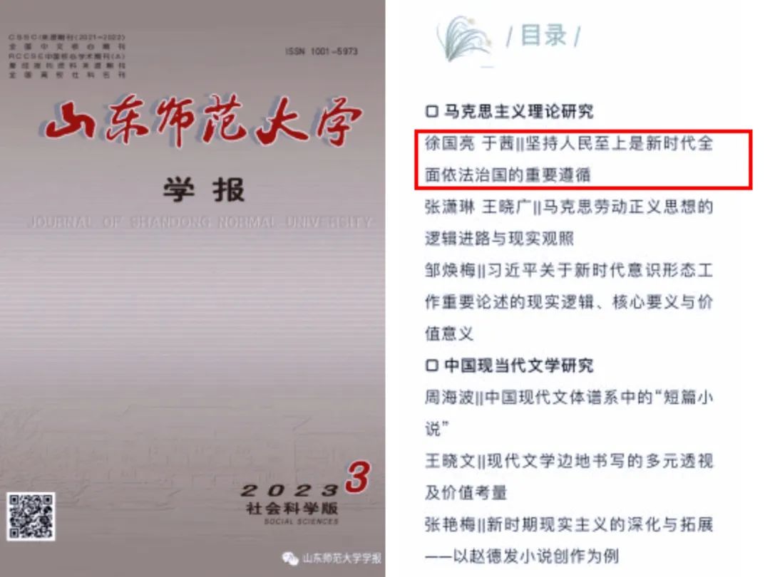 发表学术文章《坚持人民至上是新时代全面依法治国的重要遵循》,该文在《山东师范大学学报(社会科学版)》第3期发表。坚持从习近平新时代中国特色社会主义思想中悟规律、明方向、学方法,深入把握习近平新时代中国特色社会主义思想的人民性特质,深刻理解“坚持人民至上”的丰富内涵,紧紧围绕“坚持人民至上”与“新时代全面依法治国”的内在联系展开研究,切实把主题教育学习成果转化为学术科研的具体行动。