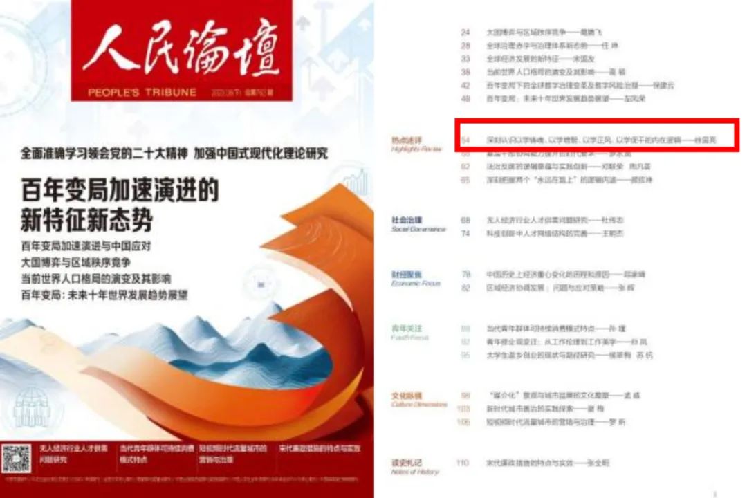 发表学术文章《深刻认识以学铸魂、以学增智、以学正风、以学促干的内在逻辑》,该文发表在《人民论坛》第12期。在学习贯彻习近平新时代中国特色社会主义思想主题教育工作会议上,习近平总书记明确指出:“开展这次主题教育,根本任务是坚持学思用贯通、知信行统一,把新时代中国特色社会主义思想转化为坚定理想、锤炼党性和指导实践、推动工作的强大力量,使全党始终保持统一的思想、坚定的意志、协调的行动、强大的战斗力,努力在以学铸魂、以学增智、以学正风、以学促干方面取得实实在在的成效。”《深刻认识以学铸魂、以学增智、以学正风、以学促干的内在逻辑》在系统学习贯彻习近平总书记重要讲话精神的基础上,围绕“以学铸魂、以学增智、以学正风、以学促干”的内在逻辑作出深刻学理阐释,以帮助大家更加全面准确地把握开展主题教育的总要求、目标任务和方法措施。