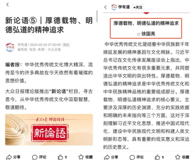 《厚德载物、明德弘道的精神追求》发表于《大众日报(理论版)》,从深厚的历史渊源、充分的实践依据和明确的未来指向等三个方面阐述了厚德载物、明德弘道精神追求的核心要义,对于深刻理解习近平文化思想、推进中国式现代化、建设中华民族现代文明和构建人类文明新形态等提出了建议。