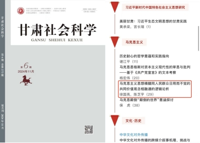 《马克思主义思想精髓同人民群众日用而不觉的共同价值观念相融通的逻辑论析》发表于《甘肃社会科学》,提出要在马克思主义基本原理同中华优秀传统文化相结合的基础上,将马克思主义真理力量同中国人民长期凝结的价值观念相结合,并赋予其新的时代内涵,推动马克思主义在中华大地牢牢扎根。
