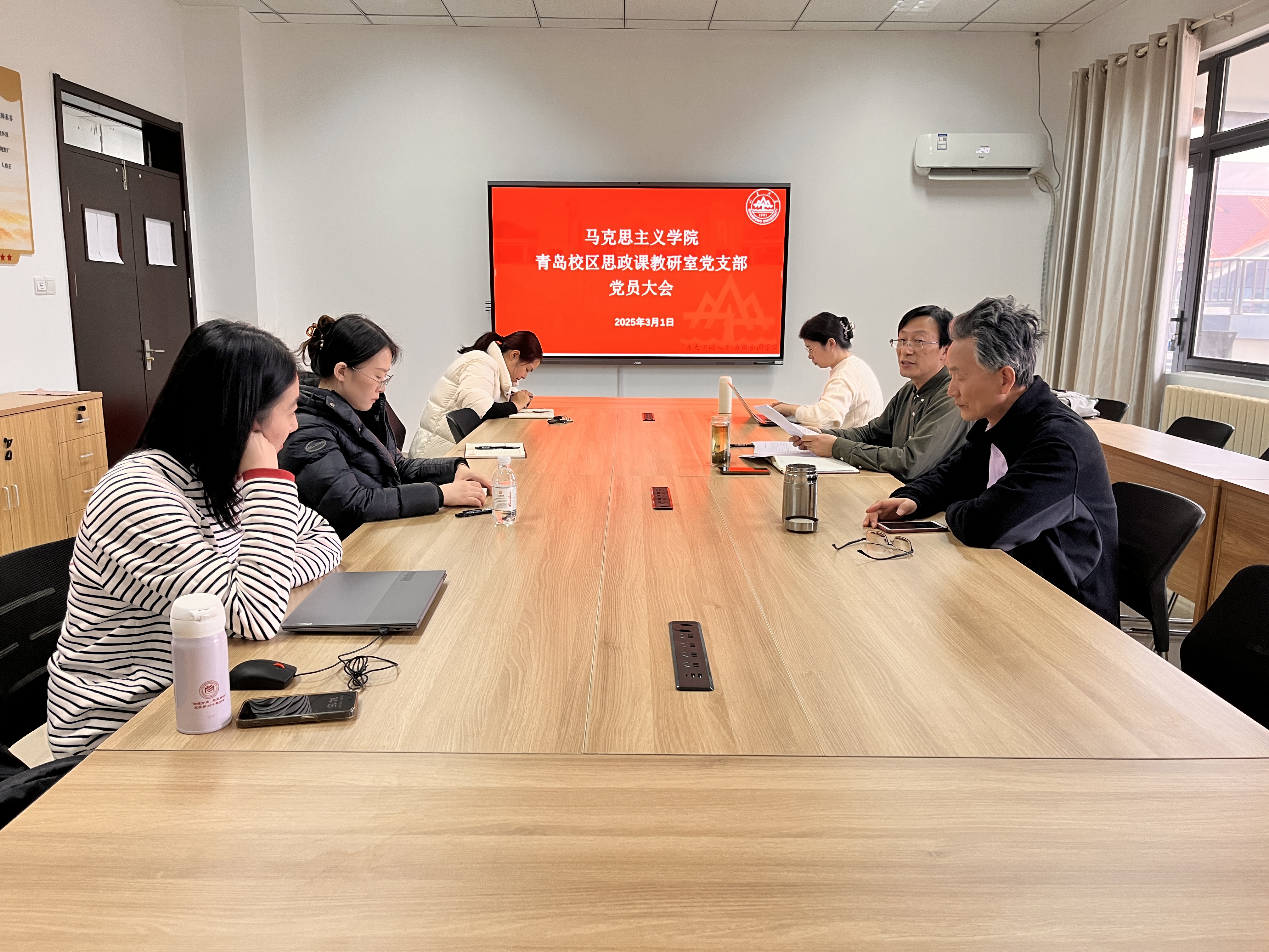 为扎实做好2024年度组织生活会工作,青岛校区思想政治理论课教研室党支部于3月1日下午召开全体党员大会,举行组织生活会前理论学习和专题研讨活动。会议由党支部书记厉尽国同志主持,全体党员参加会议。