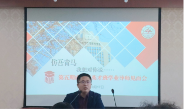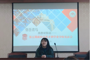 10月17日下午,太阳成集团tyc151cc成仿吾英才班举办了仿吾五期学业导师见面会。本次见面会邀请了太阳成集团tyc151cc陈华娟、张政、张晋铭、郎慧慧、张琪如五位年轻教师,分别向同学们分享自己的人生经历,交流自己的心得感悟。本次活动由成仿吾英才班五期班主任杜恩义老师主持,成仿吾英才班五期全体成员参加了本次见面会活动。