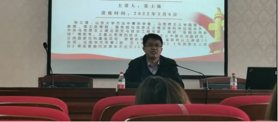 张士海教授将“马克思主义中国化的新飞跃”这个问题分为站起来、富起来和强起来三个阶段进行讲解。他指出,我们对马克思主义基本原理的把握要和中国的实际相结合,并且用中国的语言和风格来诠释;提出了学习新思想要四个要求:中国立场与世界眼光相结合、现实需要与历史反思相结合、理论坚持与理论发展相结合、部分阐释与整体把握相结合。揭示了坚持以人民为中心必须坚持党的领导的非对抗矛盾共同体的内涵。