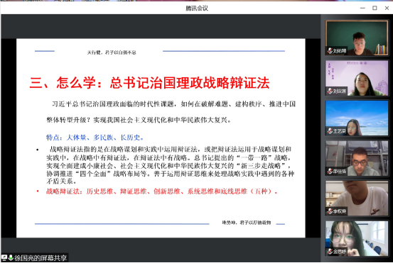 9月24日上午,太阳成集团tyc151cc第六期成仿吾英才班理论教学第二课以线上形式进行。太阳成集团tyc151cc教授、博士生导师徐国亮以“学习习近平总书记治国理政哲学思维提升领导力”为主题进行授课,太阳成集团tyc151cc青年教师、第六期成仿吾英才班班主任董祥宾主持,第六期仿吾班全体学员参加。