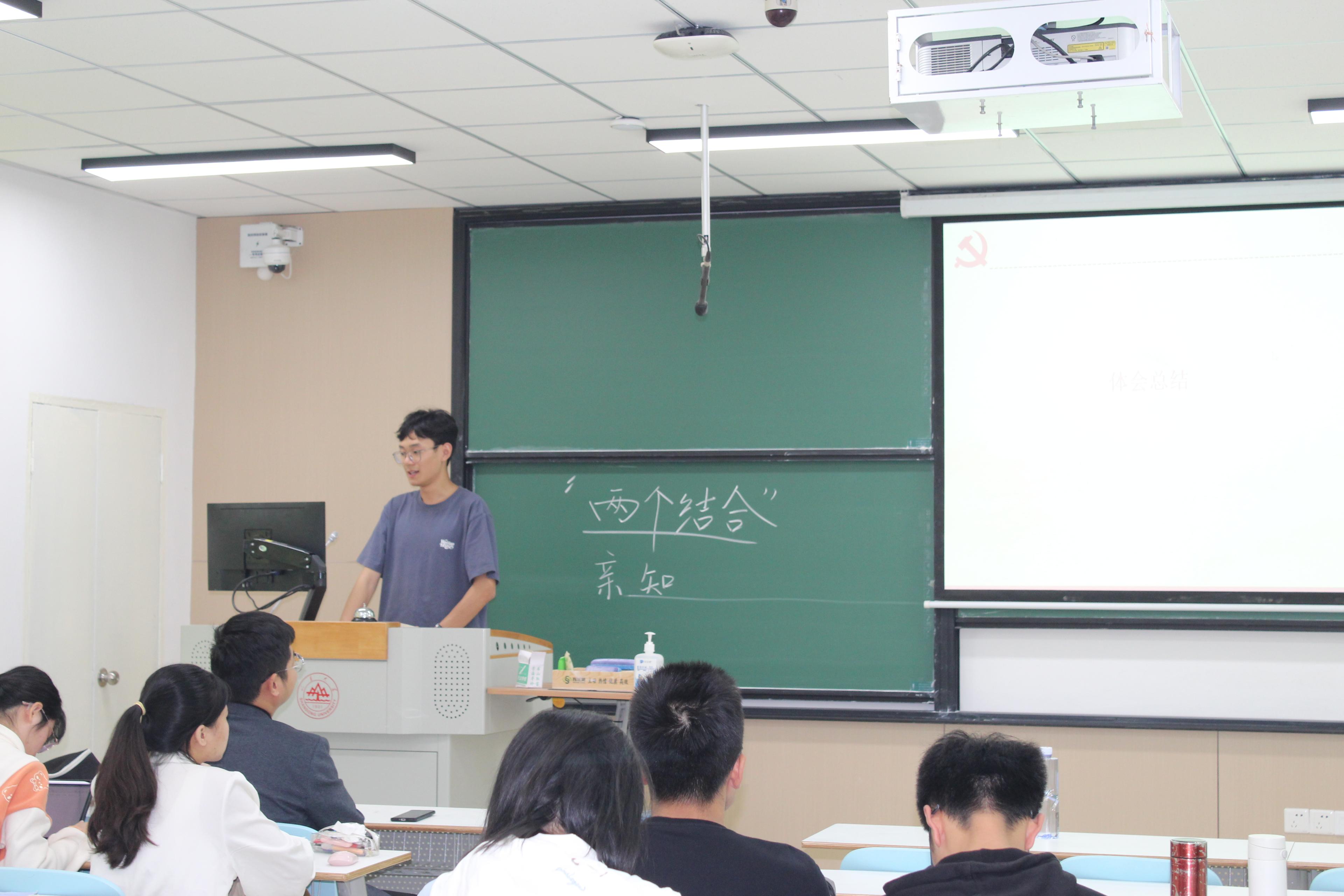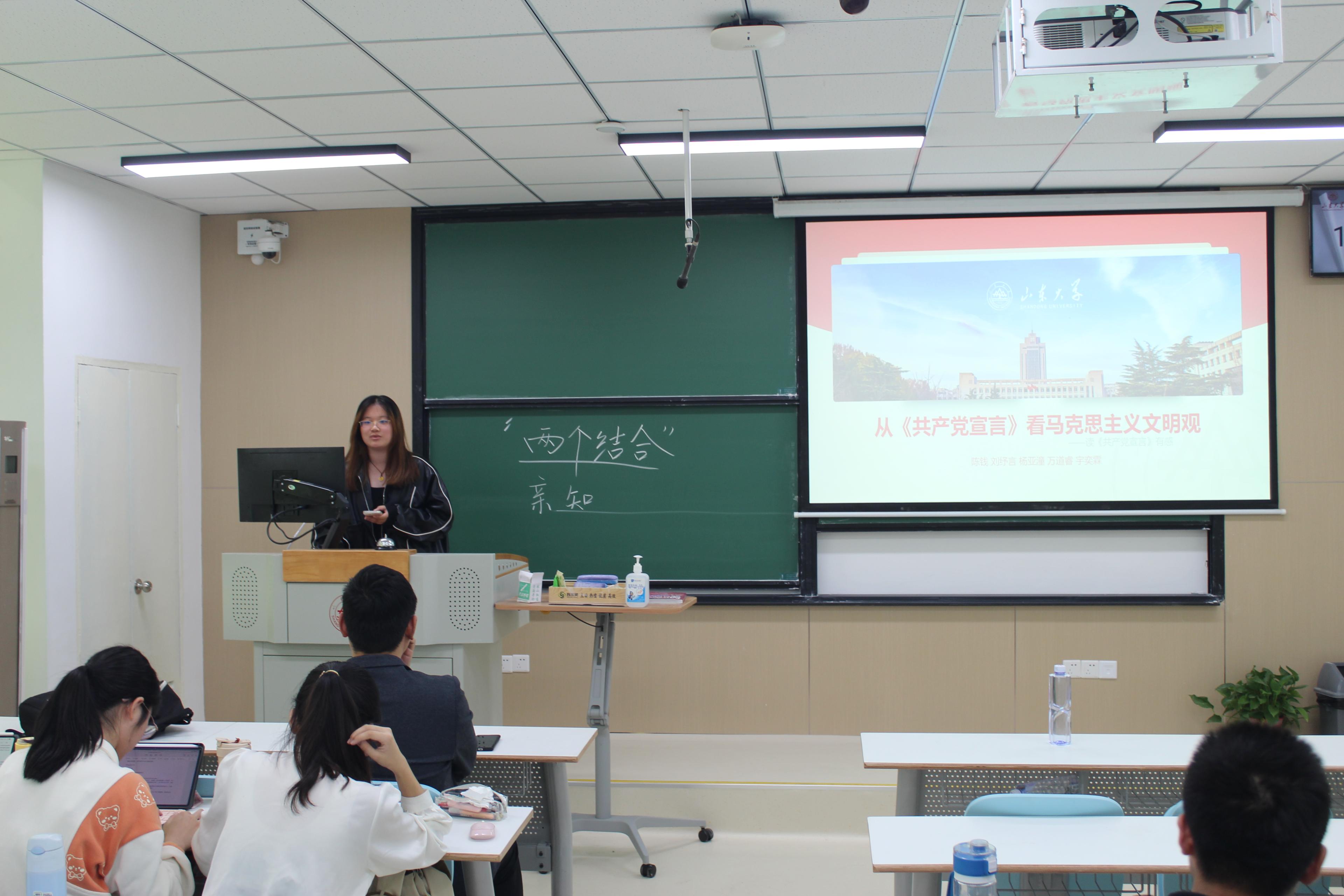 刘纾言分享了第六组同学阅读《共产党宣言》的感想,对资本主义之前文明形态进行分析,对现代资本主义文明进行辩证审视,同时从经济基础、阶级基础、思想基础三个方面论证了颠覆与超越资本主义文明的新文明形态,并从文明发展视角看《共产党宣言》当代价值。最后,刘纾言提到,可以看出马克思主义的核心思想是无产阶级和人民群众的解放与发展,最终实现以无产阶级和人民群众为代表的绝大多数人的自由全面发展。