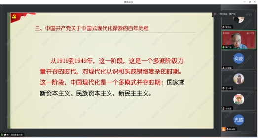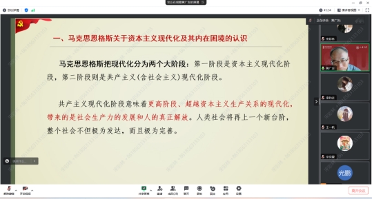 授课之初,黄广友教授指出马克思恩格斯把现代化分为两个大阶段,其中共产主义现代化阶段意味着更高的阶段,是超越资本主义生产关系的现代化。