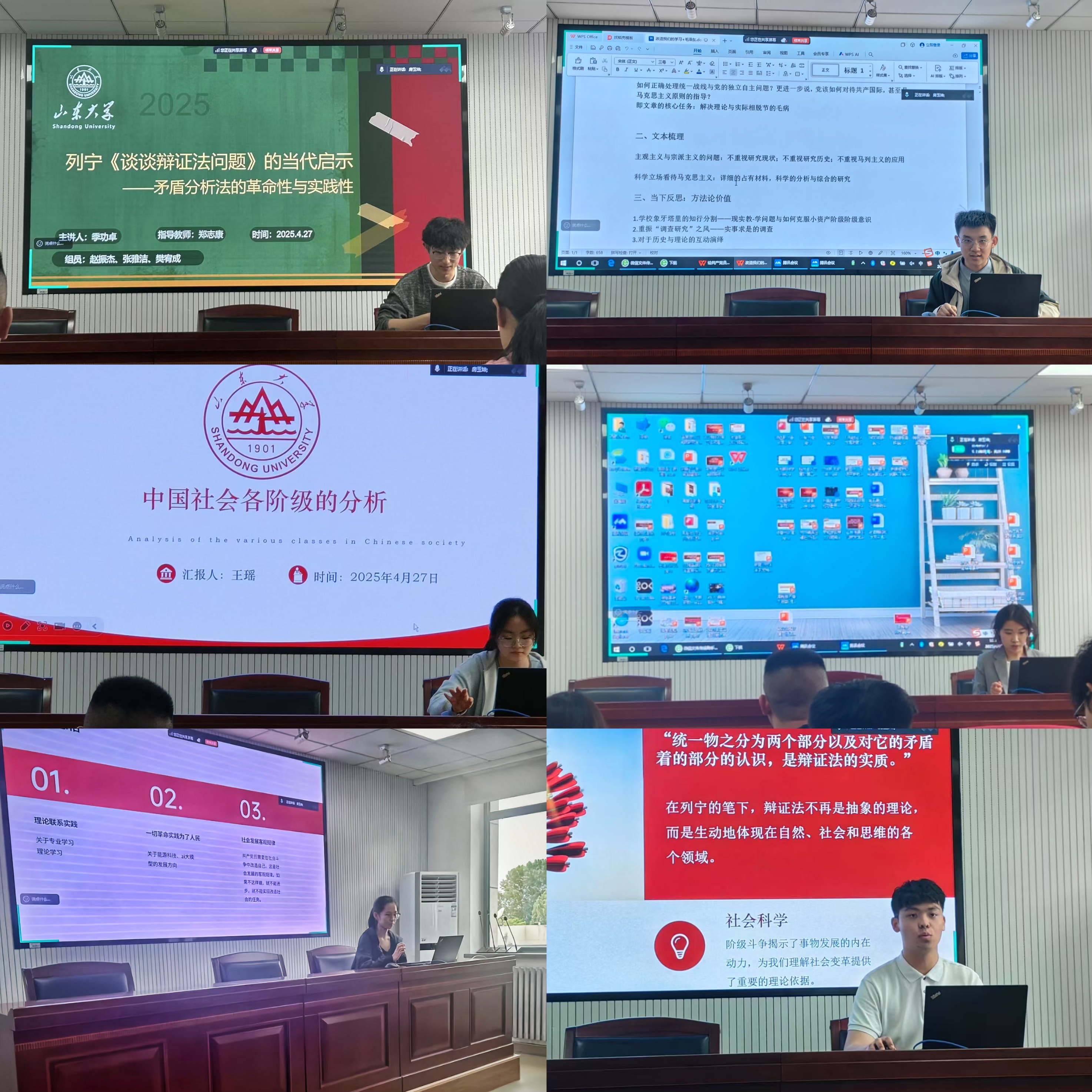 崔哲导师组研读了《政治经济学批判》序言与导言,分析生产力与生产关系在不同历史时期的相互作用,探讨了“两个决不会”理论对资本主义矛盾的揭示;宋美桦导师组研读了《论共产党员的修养》,剖析了党性修养与廉洁自律的内在逻辑,反思了数字化时代党员“慎独”精神的现实挑战;柳长浩导师组研读了《改造我们的学习》,聚焦学风建设,批评学术研究中的“碎片化”现象,提出当代理论研究应紧扣社会主义现代化建设的现实要求;赵信彦老师组研读了《谈谈辩证法问题》,结合当前社会发展中的实际问题,深入探讨了辩证思维在解决复杂问题中的重要性;郑志康老师组研读了《谈谈辩证法的问题》,探讨了辩证法在实际工作中的应用,特别是如何用辩证的眼光分析和处理党和人民群众的关系;傅辰晨老师组研读了《中国社会各阶级的分析》,结合当前社会阶层结构的变化,探讨了社会发展中的阶级斗争与阶级意识的转变;张泰老师组研读了《解放思想,实事求是,团结一致向前看》,分析了“解放思想”的时代意义与党在新时期如何应对复杂的社会矛盾与挑战。