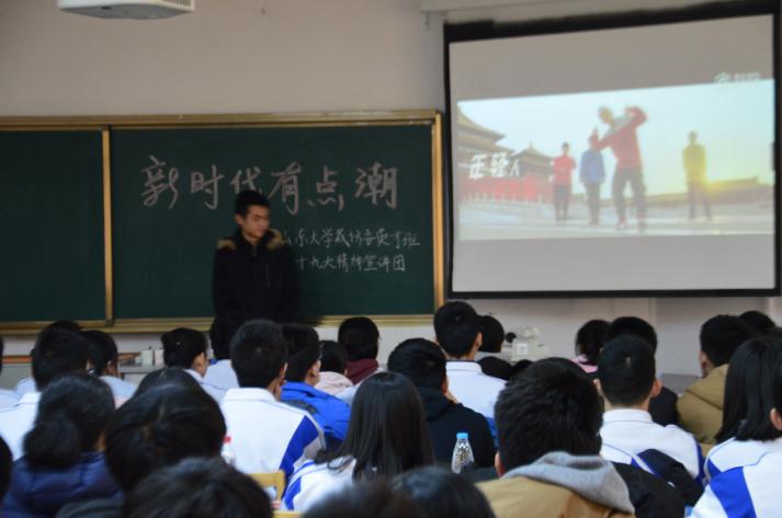 2018年1月26日,成仿吾英才班青年宣讲团赴山东省实验中学东校区进行了主题为“新时代,有点潮”的宣讲活动。英才班的11位学员向省实验中学高一高二全部班级的班长、团干部约100人进行了寒假首场宣讲。
