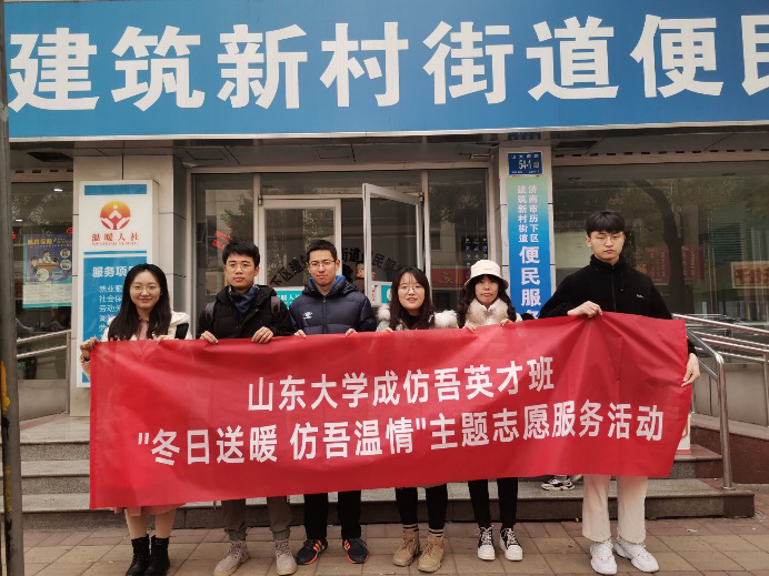 第一支队伍前往济南市建筑新村街道为环卫工人送红糖姜茶。志愿活动开展前,小队联系建筑新村街道环卫部门询问环卫工人工作的街道分布情况。小队成员提前购买纸杯、姜红糖等物资,并准备了装满热水的暖水壶。小队成员沿着街道为遇到的每一位辛勤工作的环卫工人送上一杯热乎乎的红糖姜茶并对他们的辛劳表达感谢,暖暖的姜茶传递出冬日里的仿吾温情。