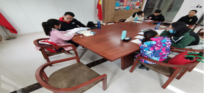 第三支队伍来到历下区创益园陪伴孩子过周末。由于孩子们的年龄跨度比较大,从幼儿园到小学六年级,所以,小队成员选择在两个活动室,分别以不同的方式对孩子们进行陪伴:对于年龄较小的孩子,多陪伴他们交流、做游戏;对于年龄较大的孩子,为他们在传授知识、答疑解惑。