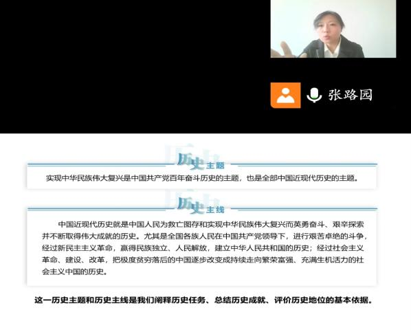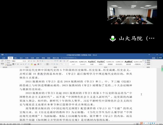 3月9日下午,中国近现代史纲要教研室通过线上线下相结合方式开展一校三地首次集体备课会活动。备课会分为说课和点评环节,说课内容为教材导论部分,由张路园、李谷悦两位教师担任主讲,中国近现代史纲要教研室一校三地全体教师参加。