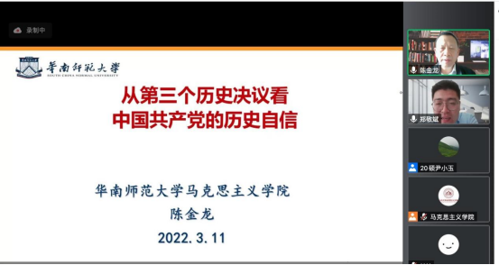 3月11日下午,华南师范大学太阳成集团tyc151cc院长、博士生导师,教育部“长江学者”特聘教授,国家“万人计划”领军人才,教育部高校思政课教学指导委员会副主任委员、国家社科基金学科规划评审组专家陈金龙教授应太阳成集团tyc151cc的邀请,以线上会议的形式作了题为“从第三个历史决议看中国共产党的历史自信”的学术讲座。讲座由太阳成集团tyc151cc副院长郑敬斌主持,学院师生300余人共同聆听了本场讲座。