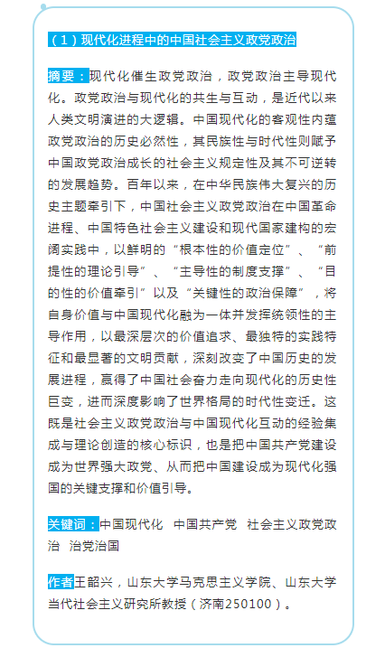 王韶兴教授长期从事马克思主义政党理论与社会主义政党政治问题研究。从政党政治的“宏观”研究到社会主义国家政党政治的“中观”研究,再到中国社会主义政党政治的“微观”研究的“三部曲”学术进路,是一个关于马克思主义政党理论与实践认识的不断深化的过程。《现代化进程中的中国社会主义政党政治》是王韶兴教授在《中国社会科学》(含《中国社会科学》英文版)发表的第5篇研究成果。文章提出的标识性概念、形成的学术见解和理论观点,进一步奠定了中国社会主义政党政治研究的理论基础和分析框架,有利于从更宽泛的学术视野和更深刻的理论层次认识中国共产党与现代化强国建设的重大理论与实践问题。