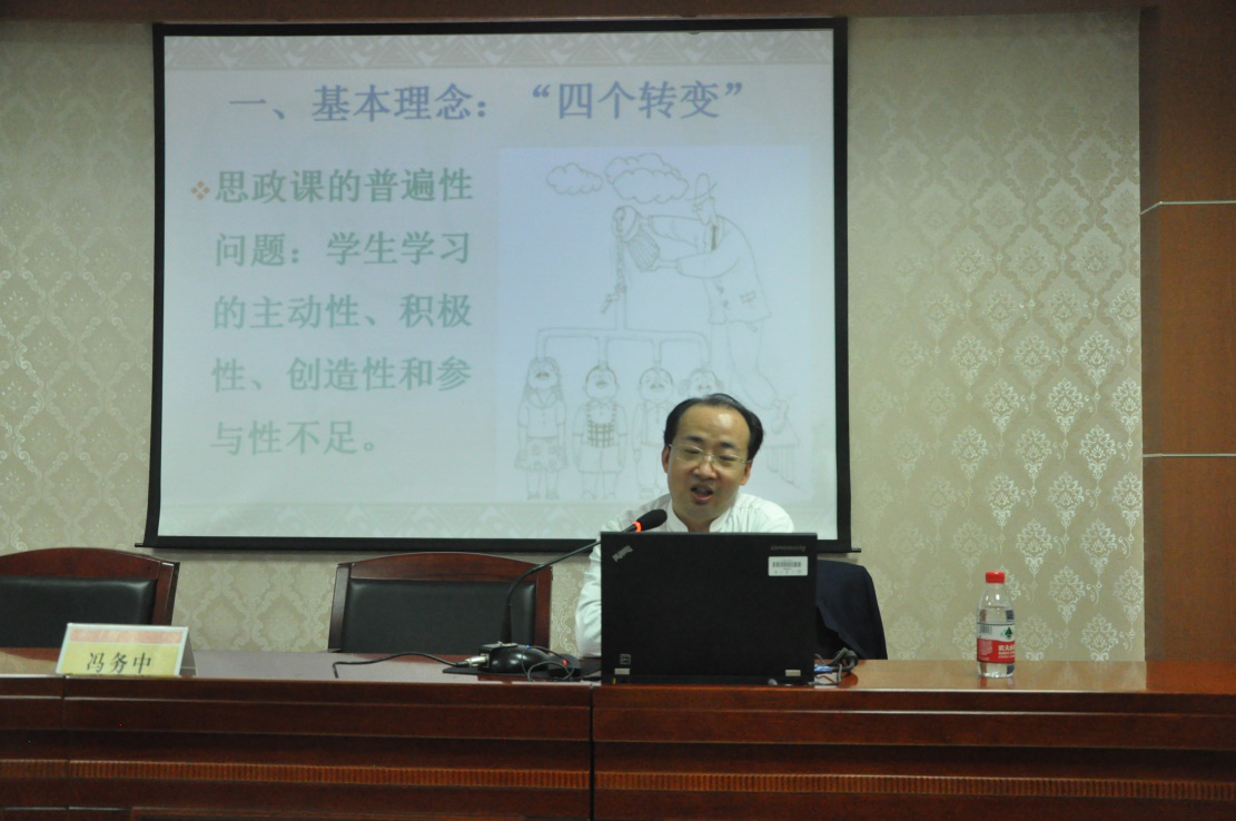 报告会上,冯务中以目前思政课教学中普遍存在的学生学习主动性、积极性、创造性和参与性不强等现实问题为切入口,向在座的各位师生阐释了“导客为主”的混合式教学模式。他指出,“导客为主”教学模式在其基本理念上改变了过去以教师的“教”为中心的传统思维,转而将学生的“学”作为核心要旨,这一理念的转变主要体现为教师角色从讲授者向引导者转变、教学重点从如何教向如何学转变、学生地位从教学对象向教学主体转变、学习方式从被动学习向主动学习转变;在讲授方法上,教师不能仅仅满足于看着教材内容“照着讲”,还应加强对重大理论与实践问题的研究来“接着讲”、通过认真批判错误观点“对着讲”、最终实现具有个人特色的“自己讲”;在实施过程中,要注重吸引学生动耳听讲、鼓励学生动口言说、要求学生动目阅读、引导学生动手写作、指导学生动足行动“五管齐下”。冯务中强调,实施“导客为主”教学模式应有高度的问题意识,要坚持以问题为导向,注重提炼核心问题以启发学生深入思考、自主学习,该教学模式的关键在于遵循“淡化期末,强化平时”原则进行考核方式改革。