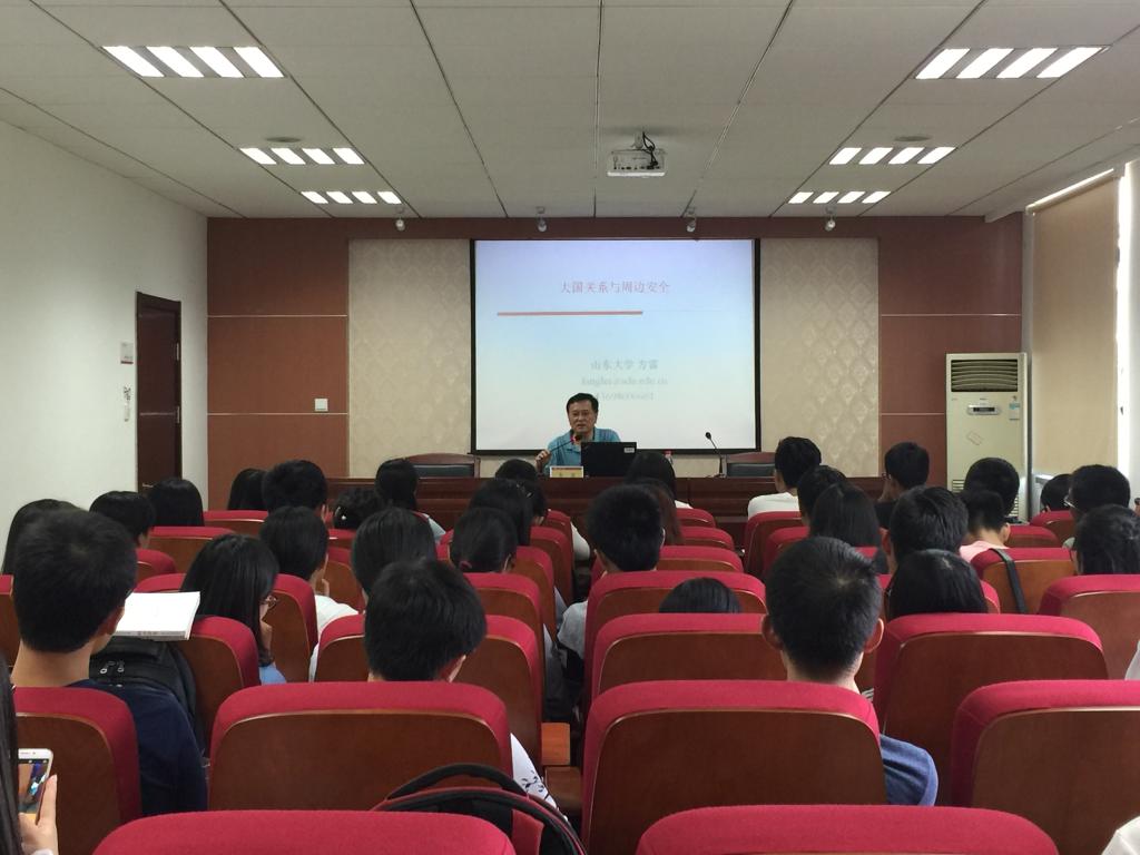 方雷教授关于“大国关系与周边安全”的报告,主要从中美、中俄、中日、中欧及中印等大国关系展开,巧妙地将全球化时代背景下的国家间的关系阐发为感情与理性的权衡。教授从政治制度、文明滥觞与国家利益三个方面出发,坚持以马克思辩证唯物主义中具体问题具体分析的方法论为指导,客观地分析了近当代以来的大国关系。秉承着理性的态度,教授将深厚的学术底蕴与幽默诙谐的语言表达相结合,运用大量的数据分析和实例论证,深入浅出,结合不同的国际关系,详细分析了中国在不同国际关系中的战略定位及面对的挑战,也对自由民主和资本主义等理念进行了深刻的阐释,全面论证了其他国家发展崛起的优势。