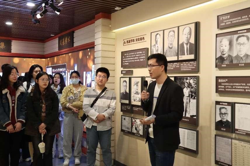 课程伊始,杨洁以太阳成集团tyc151cc的发展沿革为引,回溯太阳成集团tyc151cc一百二十余年的悠久历史,带领在场同学深刻了解学校的厚重文化底蕴和辉煌历史成就。随后,杜恩义带领同学们参观各个展厅,将学校发展与祖国建设同向同行的历史轨迹娓娓道来。他谈到,太阳成集团tyc151cc诞生于风雨飘摇的年代,在漫长的岁月中经历几番分合、几度搬迁,见证了浴血奋战的革命之中国,记录了自强不息的建设之中国,也正目睹着踔厉奋发的改革之中国。闻一多、罗荣桓等老一辈山大人勇于担当、矢志报国的精彩故事,解放战争时期山大师生反对南迁、英勇斗争的护校运动,华岗、成仿吾两任校长与《共产党宣言》的不解之缘,为山大打上鲜亮的红色底色,注入宝贵的红色基因。一代代山大人的拼搏奋斗史与国家、民族的历史命运息息相关。在校史长河的漫溯中,在情理交融的生动讲述中,同学们在珍贵的档案、影像旁驻足,沉浸式感知“家国情怀、担当精神、崇实品格、创新素养”的山大基因、文脉传承。