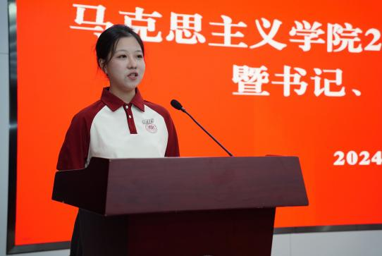 马明冲教授作为教师代表发言。他代表学院师生向每一位2024级新生表示最热烈的欢迎与最诚挚的祝愿,并对同学们提出了三点希冀。第一,要潜心学习、苦练本领。学生的本职工作是学习,作为马克思主义理论的研究者和传播者,新一代的青年马克思主义者应“学好马发史、读好马经典、用好马原理”,在理论与实践相结合的高度解答好时代发展的大问题。第二,要明德修身、与人为善。既要坚持立德树人、崇德修身,在明大德的基础上,不断提高自己的品德修养;又要加强团队意识,与人为善,处理好与老师同学之间的关系。第三,要提升格局,胸怀天下。格局决定了一个人能够走多远路、干多大事。目光长远、不拘泥于小节,才能谋大事,始终为国家、民族、人民的现代化事业而奋斗。他祝愿同学们在未来几年,以梦为马、不负韶华,学思用贯通、知行合一,为实现中华民族伟大复兴贡献青春力量。
