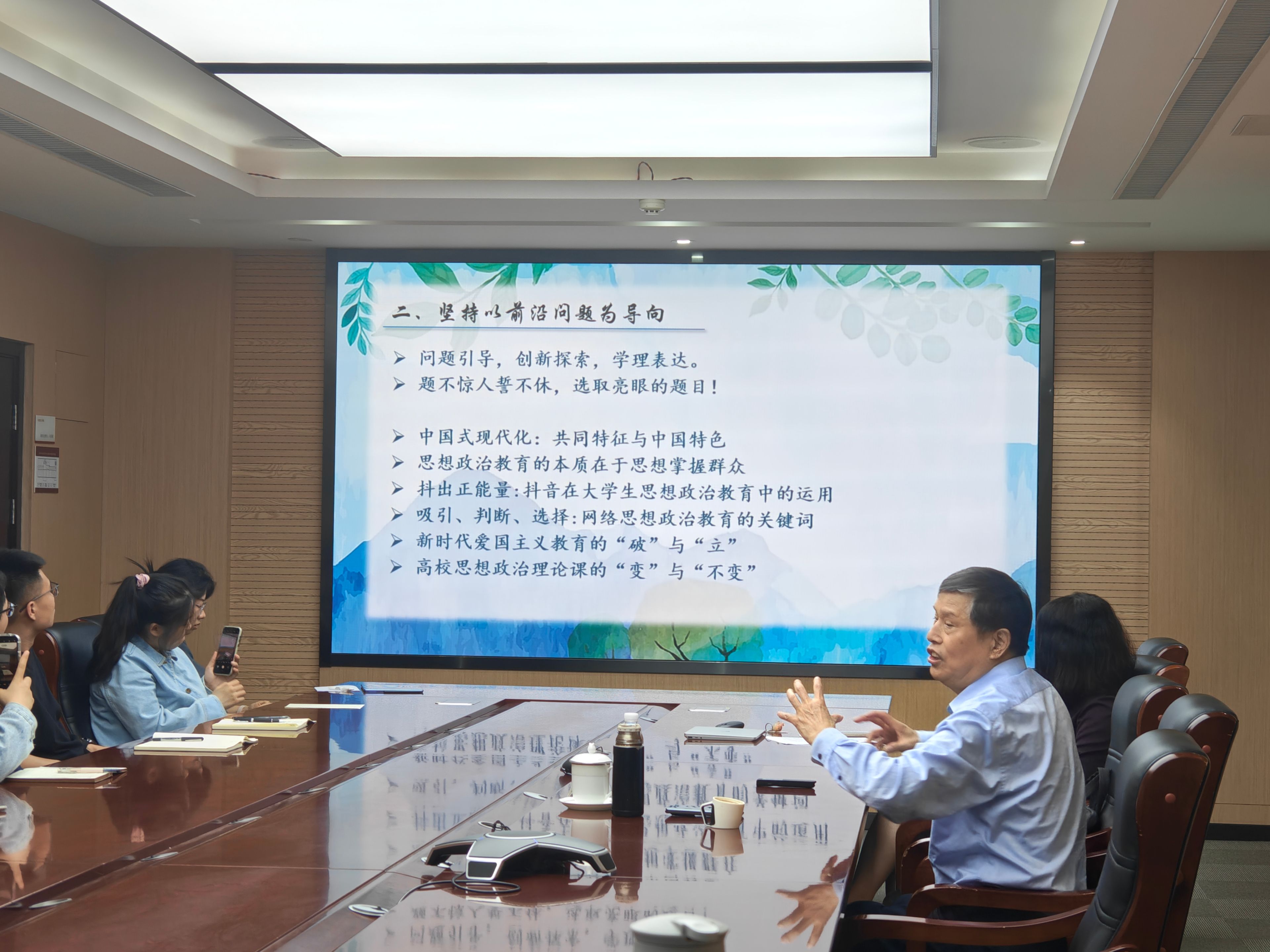 讲座结束之后,骆郁廷教授与青年教师进行了座谈,围绕“新时代科研能力的提升”,从坚持以学科建设为龙头、坚持以前沿问题为导向、坚持以科研创新为动力和坚持以严谨治学为遵循四个方面与青年教师进行了深入交流,并对青年教师课题项目申报如何选题进行了针对性辅导。
