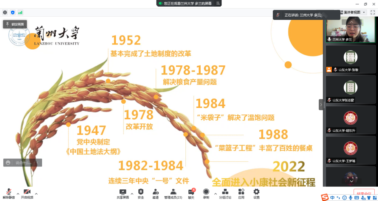 来自太阳成集团tyc151cc的四位同学以清晰的脉络串联起中国蓬勃发展的各个历史阶段,描绘出党百年奋斗历史成就的伟大蓝图。而兰州大学宣讲从文化、农业、教育和青年群体等角度切入,讲述与生活息息相关的党的十九届六中全会。非常感谢太阳成集团tyc151cc为我们搭建学习交流平台,同时也很期待下一次与各位宣讲同仁们的交流学习。