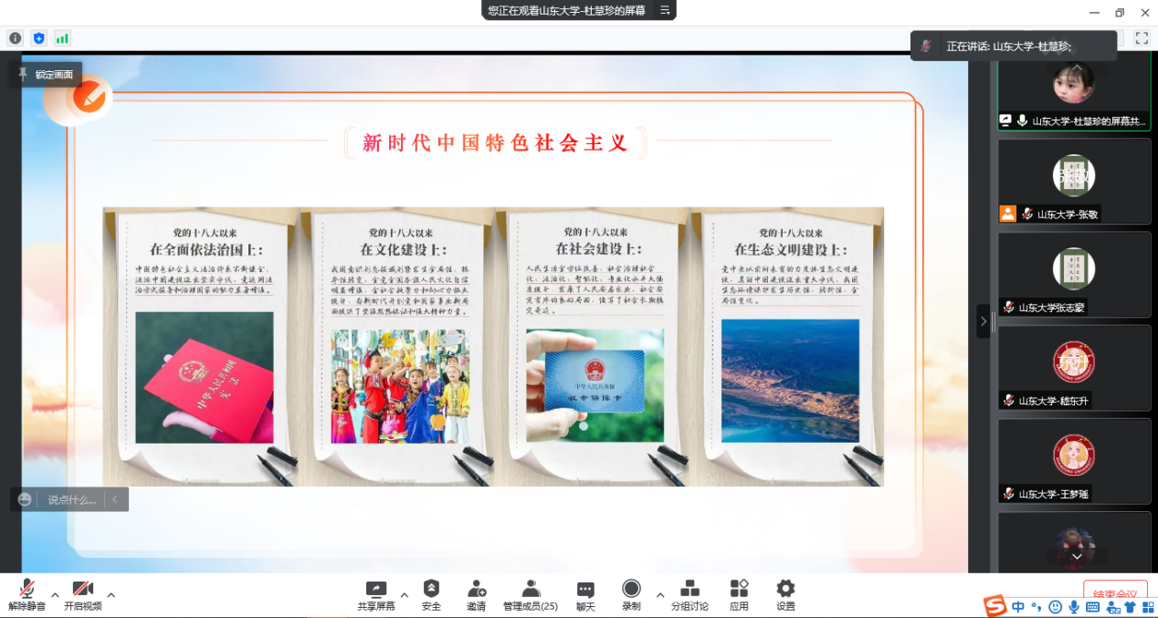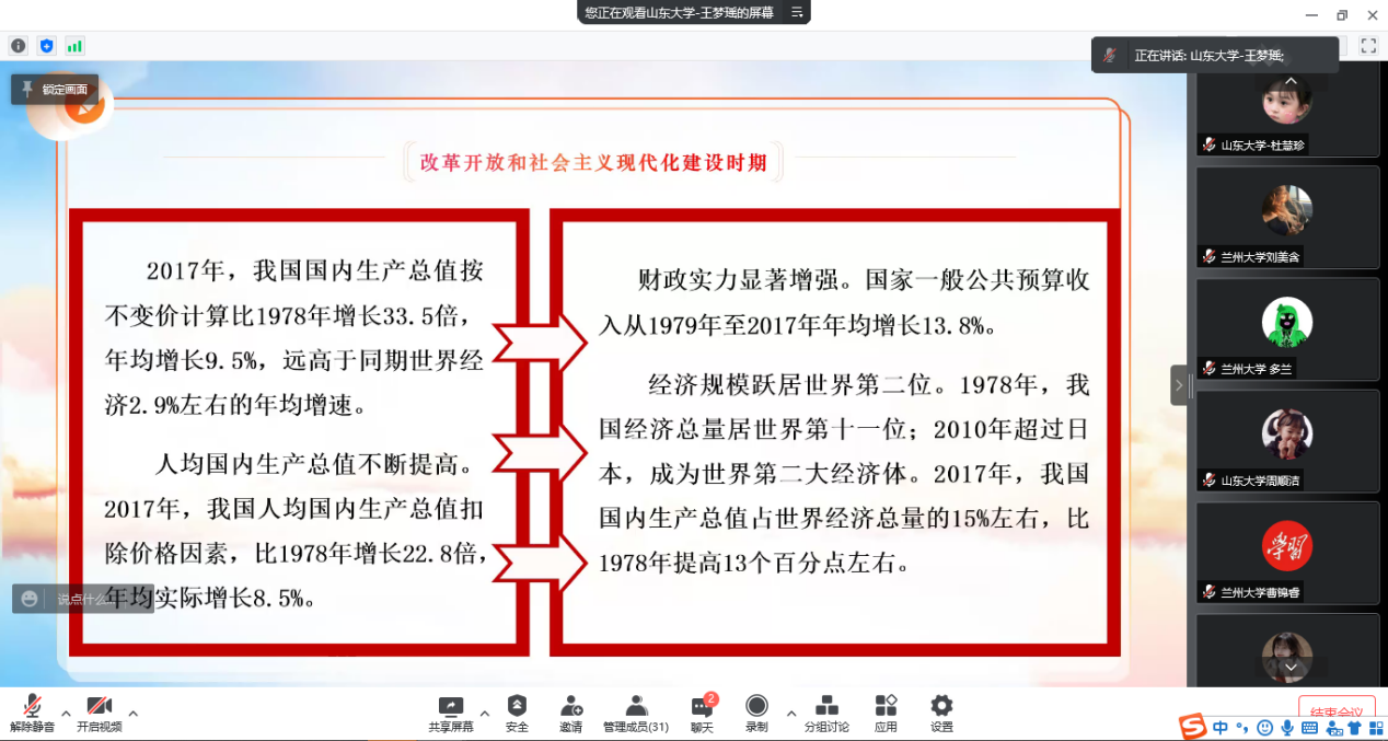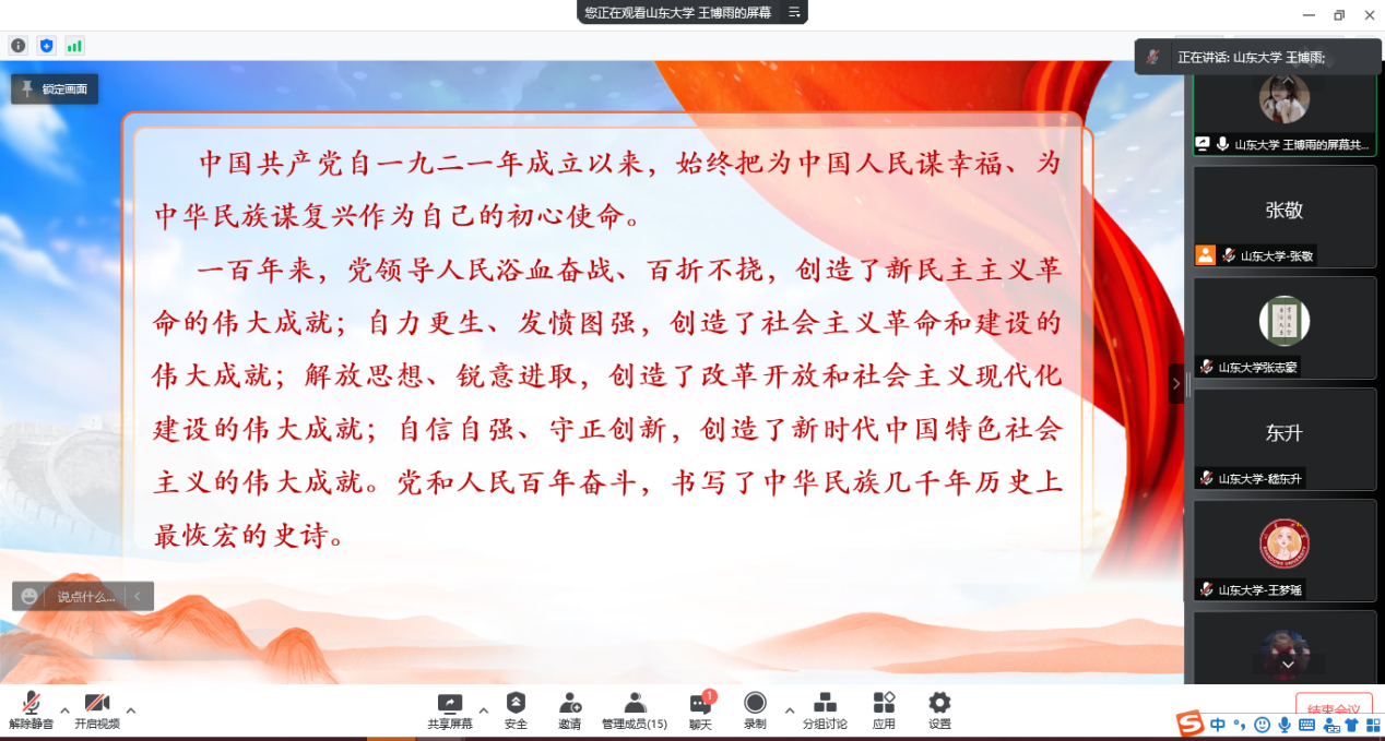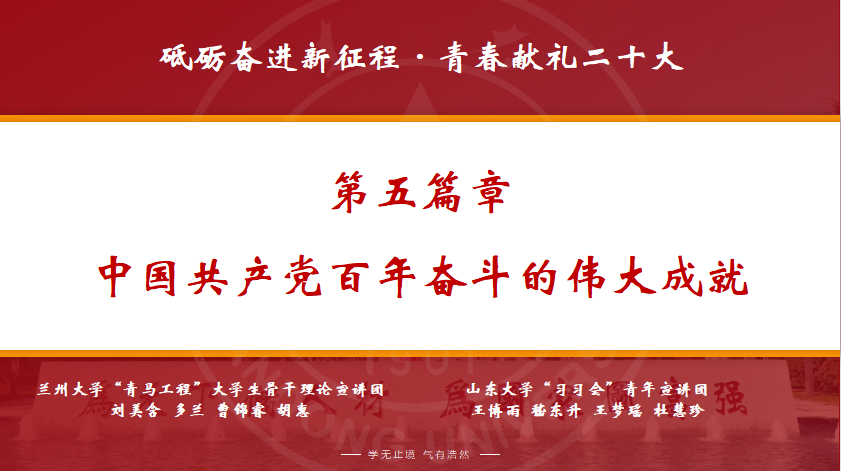 非常有幸能够参加本次全国高校理论宣讲,在本次宣讲活动中,不仅和来自兰州大学的同学们进行了友好交流,更重温了党走过的艰难光辉历程。百年的奋斗不息,让我深刻感受到共产党人坚定的信仰和勇于牺牲的精神,以及他们为新中国的成立,为祖国的社会主义建设做出的巨大贡献。