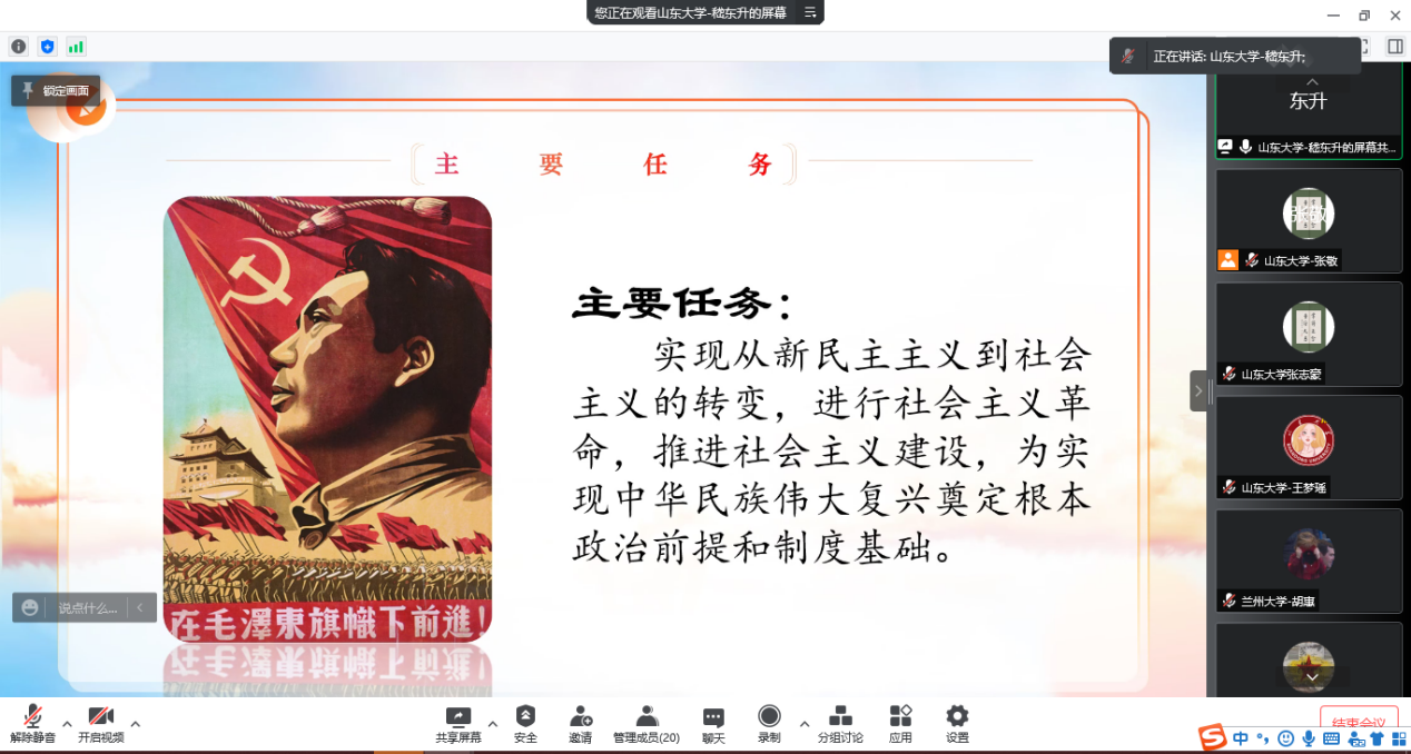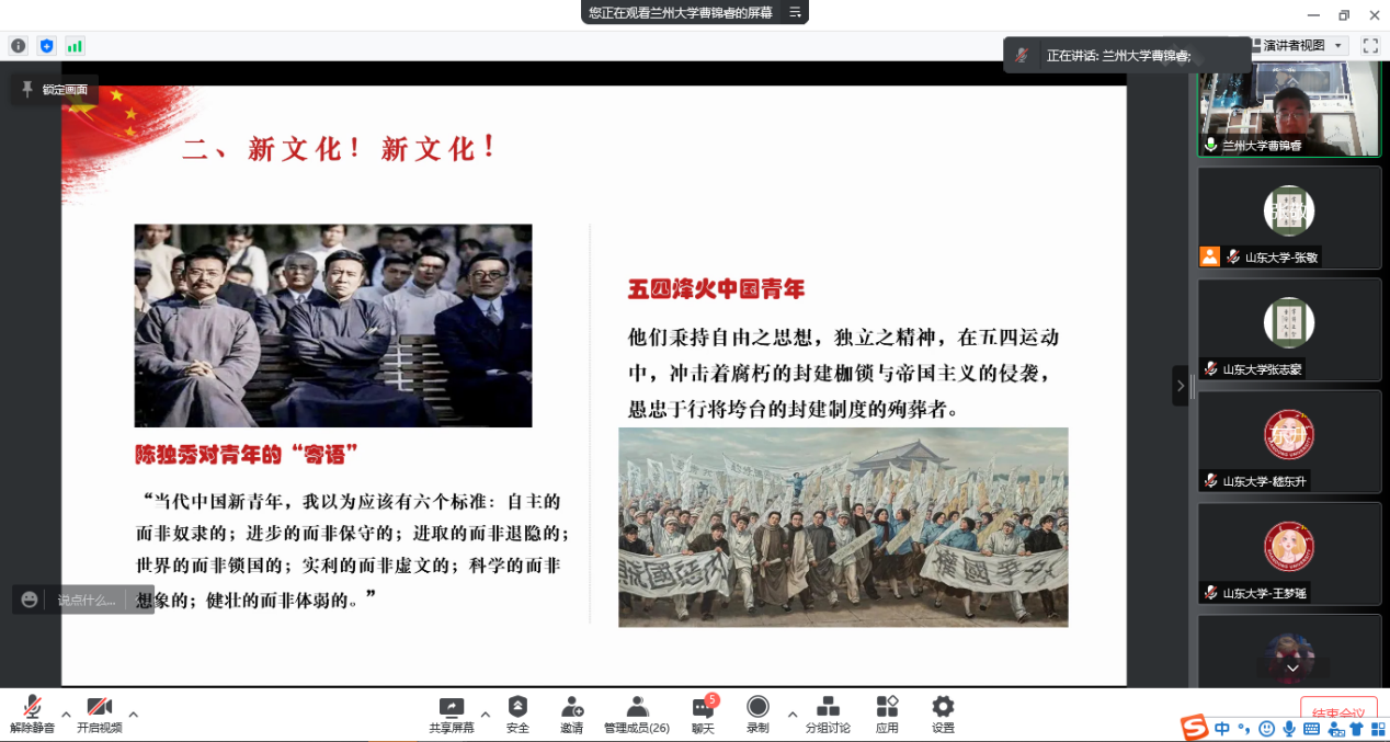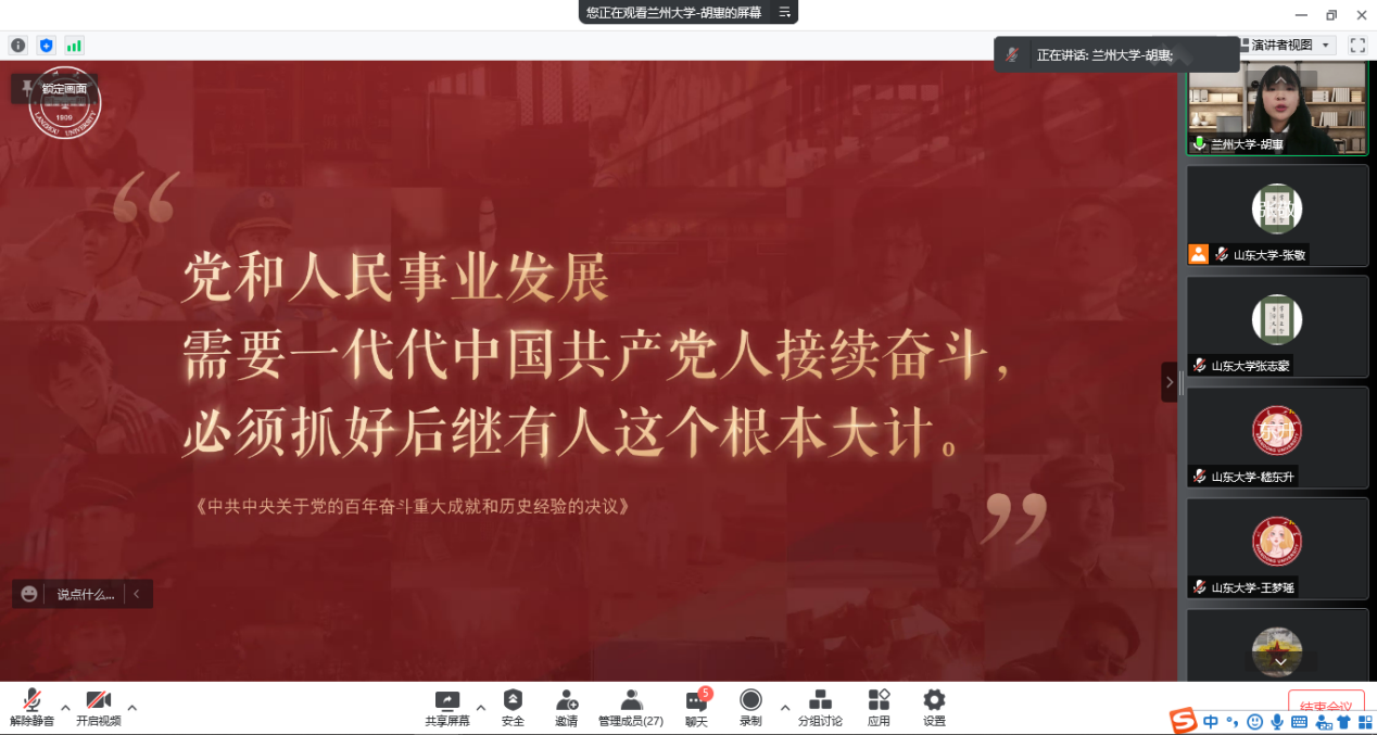 高校理论宣讲团“砥砺奋进新征程•青春献礼二十大”主题接力宣讲第五篇章:“中国共产党百年奋斗的伟大成就”于3月26日上午顺利举行,此次宣讲采用腾讯会议的形式,由太阳成集团tyc151cc习近平新时代中国特色社会主义思想青年学习会(以下简称“习习会”)宣讲团与兰州大学“青马工程”大学生骨干理论宣讲团主讲,多所高校青年学生积极参与。活动由太阳成集团tyc151cc“习习会”青年宣讲团成员张敬主持。