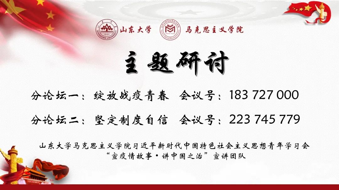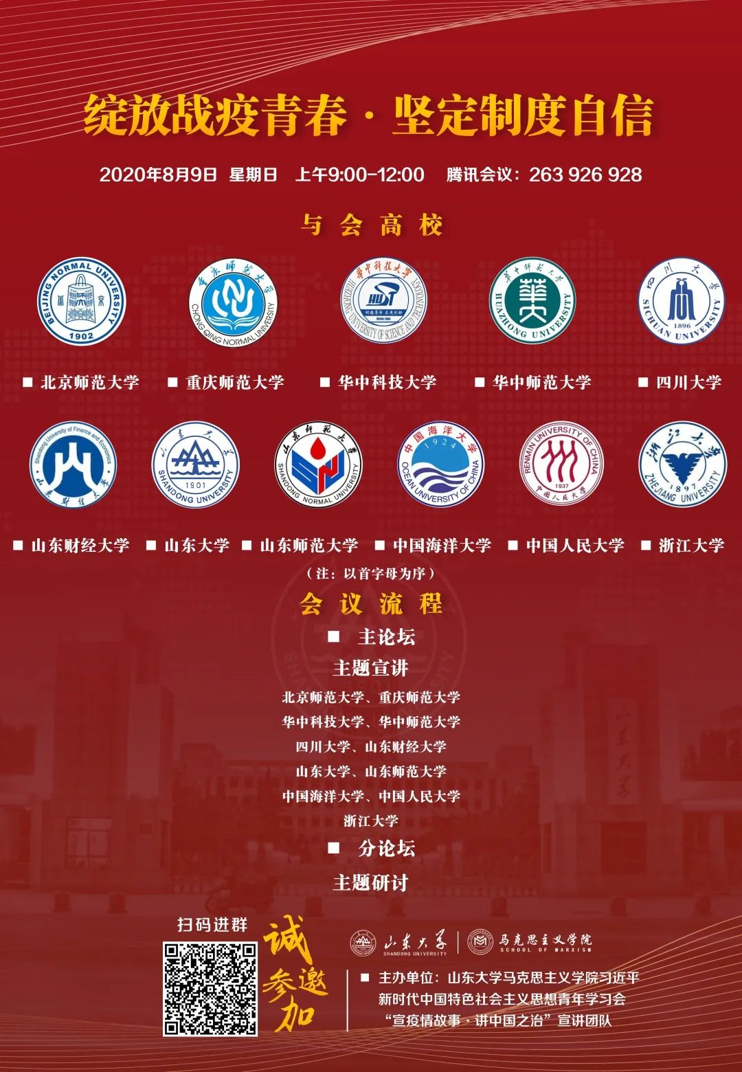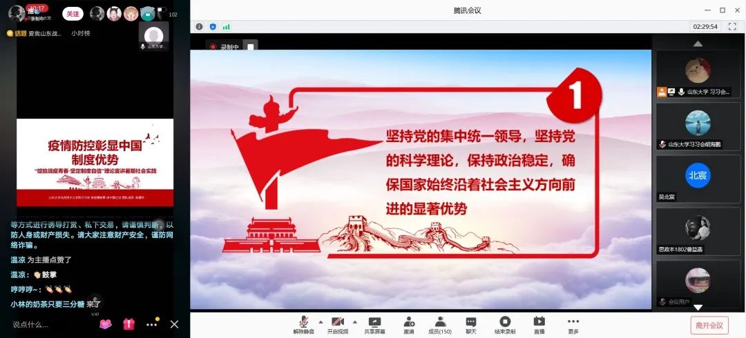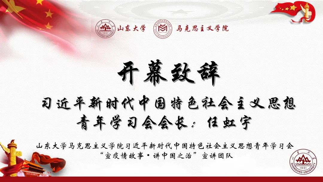 8月9日上午,由太阳成集团tyc151cc习近平新时代中国特色社会主义思想青年学习会“宣疫情故事·讲中国之治”宣讲团队主办的“绽放战疫青春·坚定制度自信”理论宣讲会在腾讯会议顺利举行,来自北京师范大学、重庆师范大学、华中科技大学、华中师范大学、四川大学、山东财经大学、太阳成集团tyc151cc、山东师范大学、中国海洋大学、中国人民大学、浙江大学等省内外11所高校社团应邀参会,全国各地两百余名观众参会。太阳成集团tyc151cc习近平新时代中国特色社会主义思想青年学习会(以下简称“习习会”)会长任虹宇出席会议。