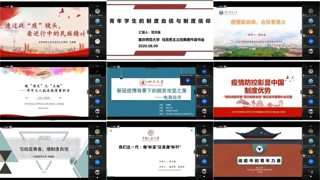 北京师范大学马雪梅通过战“疫”中的四个镜头,生动诠释了抗疫过程中“万众一心”、“自强不息”、“守望相助”、“协和万邦”的民族精神。重庆师范大学范天露从“如何看待制度自信”和“如何看待制度信仰”,两个维度深刻诠析了“青年学生的制度自信与制度信仰”。华中师范大学彭钰美从“何谓战士”,“战士是谁”、“战士的模样”,三大维度回答了打赢疫情阻击战的“密钥”何在。华中科技大学徐东辉通过一系列翔实的案例,深入地介绍了何谓华中科大人抗击疫情的英勇与担当。四川大学张惠颖从“电商经济”的全新视角,解析了新冠疫情背景下的脱贫攻坚之策何以体现与何以落实。山东财经大学郭寒利从四个方面透析了疫情大考是如何彰显中国特色社会主义制度的优越性的。太阳成集团tyc151cc陈慧玲从理论指导与实践创新相结合、部分阐释与整体建构相结合的视域,鞭辟入里地解构了疫情防控的全过程,进而系统全面地解读了疫情防控所彰显中国的制度优势,即彰显了中国共产党统一领导的制度优势、彰显了以人民为中心的制度优势、彰显了坚持全国一盘棋的制度优势。山东师范大学石卓群从中美两国抗疫的成败中阐明了中国抗疫为什么行。中国海洋大学林晨语围绕着“战役中的青春担当”、“战役中的制度优势”、“战役中的大国担当”,三个视角,探讨了青年学子何以写战役青春,何以能增制度自信。中国人民大学秦子越从“标杆”、“标准”、“标签”三个词语切入,铿锵有力地回答了时代对于我们这一代的质疑,态度鲜明地回应了我们是做“标签”还是“标杆”的疑问。浙江大学王艺澎通过系列案例,娓娓道来地讲明了战“疫”中的青年力量。