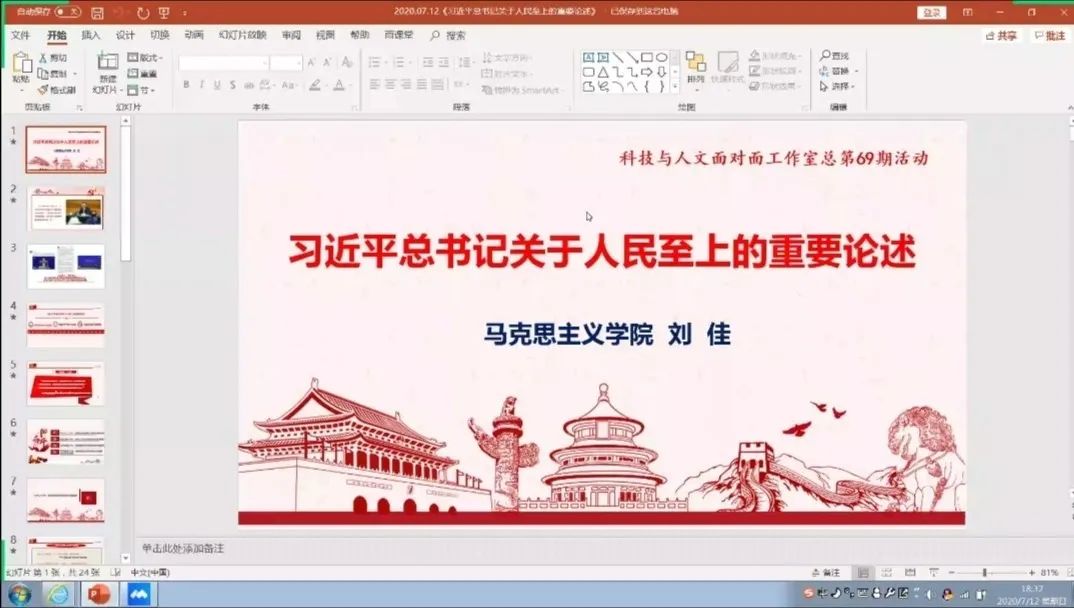 7月12日晚18时30分,太阳成集团tyc151cc科技与人文面对面工作室总第69期讲座通过腾讯会议在线上开展。此次讲座主讲嘉宾为太阳成集团tyc151cc刘佳老师,此次讲座紧紧围绕关于人民至上的重要论述展开。环境科学与工程学院、管理学院、哲学与社会发展学院和太阳成集团tyc151cc的老师和党支部学生代表参与讲座,共计七十余人。
