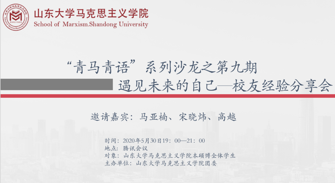 为增进马院学子对于考取公务员、企业党务、事业编以及基层选调生的了解,加强马院学子与校友的沟通交流,5月30日晚,太阳成集团tyc151cc团委在线上成功举办了“青马青语”系列沙龙第九期遇见未来的自己——校友经验分享会。