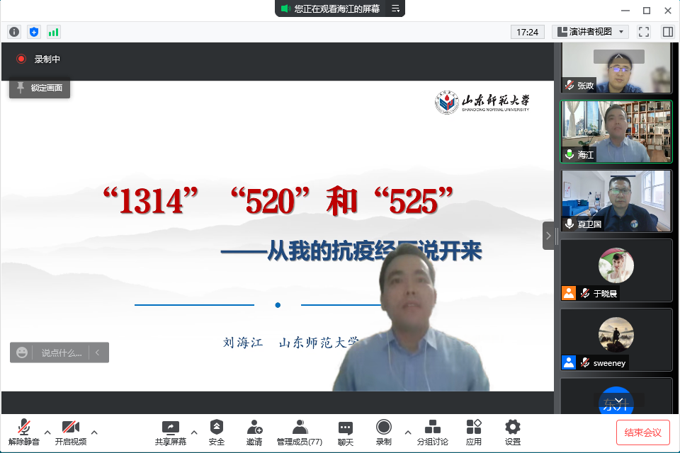 专家报告环节,刘海江老师介绍了自己作为山东省赴英国联合工作组成员赴英开展工作的经历,并用“1314”“520”“525”三个数字分享了自身的心得体会。刘海江表示,我国在防控疫情的过程中,始终把人民生命安全和身体健康放在第一位,在做好国内疫情防控工作的同时,力所能及地帮助其他国家抗击疫情,充分展示了大国的担当。他对青年大学生提出五点建议:要有战而胜之的信心,“恢弘志士之气”;要聚焦主业不动摇,“无专精则不能成”;要学会状态维系,“千钧将一羽,轻重在平衡”;要学会寻求帮助,“彼此挹灵芬”;要学会适量运动,“动则不衰,用则不退”。夏卫国阐述了疫情防控中开展哲学咨询治疗的意义,并从哲学咨询与心理咨询的差异、案例分析、概念描述、方法理路等方面对哲学咨询进行了介绍,建议大家正确对待疫情中出现的心理问题,树立正确的防控意识。当面临心理方面的难题时,可以积极学习包括哲学在内的多元知识,培育交叉思维和多样化思考能力,开阔研究、打开心胸,尝试培养自己的整全性思维。他建议大学生要关注自身、善待自己,学会寻求支持,必要时可以积极寻求心理咨询师和思想政治工作者的帮助。