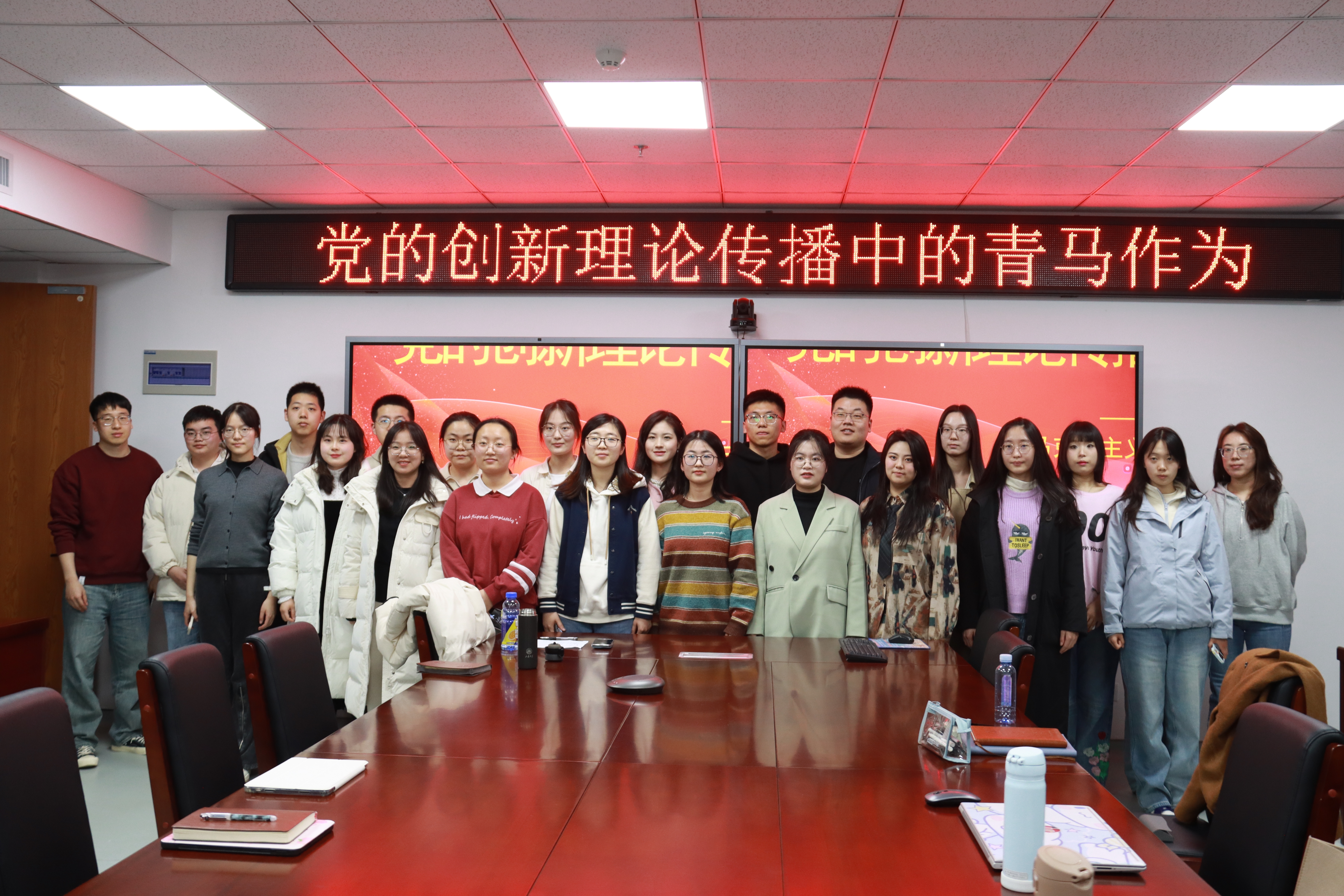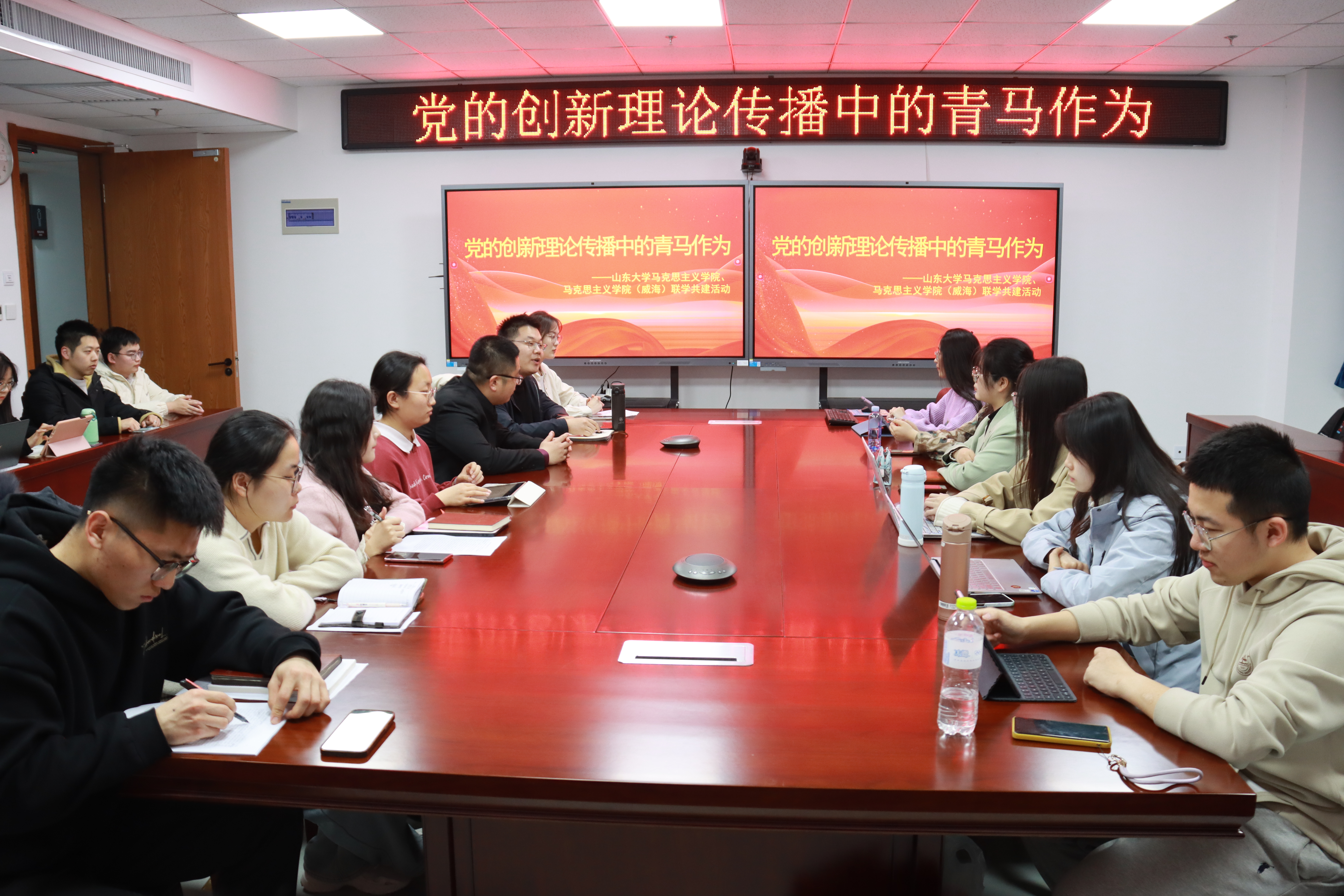 为持续深化巩固学习贯彻习近平新时代中国特色社会主义思想主题教育成果,加强两地太阳成集团tyc151cc的深入交流与合作共建,3月23日,太阳成集团tyc151cc、太阳成集团tyc151cc(威海)在威海校区举办联学共建系列活动。本次活动主题为“党的创新理论传播中的青马作为”,太阳成集团tyc151cc助理研究员张政老师、太阳成集团tyc151cc(威海)辅导员杨在政老师参加联学,两地学生骨干代表参加。会议由2022级硕士研究生初昕蔚主持。