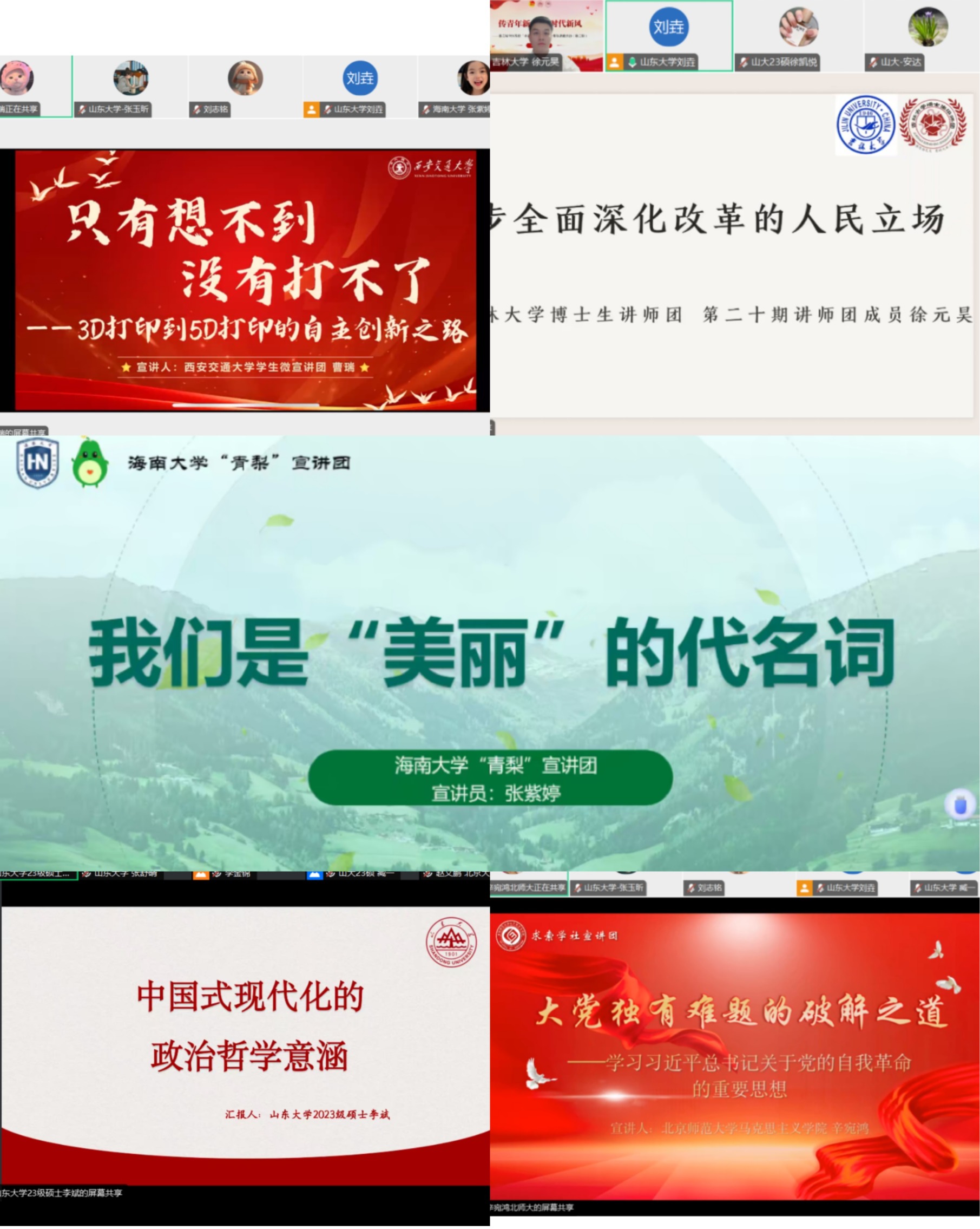 为进一步学习、宣传、贯彻党的二十大精神,不断丰富和推进中国式现代化理论体系的青年化阐释,太阳成集团tyc151cc习近平新时代中国特色社会主义思想青年学习会携手北京大学、清华大学、中国人民大学、北京师范大学、北京理工大学、吉林大学、复旦大学、浙江大学、武汉大学、吉林大学、西安交通大学、海南大学等高校马院党支部及高校讲师团,联合开展第三届全国高校“小青马”联学联讲暨集体备课活动。本次活动分为三期接续展开,来自全国10余所高校讲师团的28位优秀青年学子踊跃参与、联袂开讲,线上参会800余人次,充分展现了青年一代扎实的理论功底与深厚的学科素养,激发了青年学子的使命与担当,使党的创新理论在新时代熠熠生辉。
