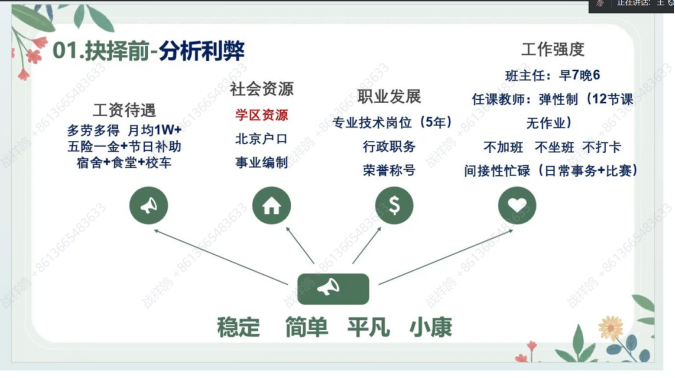 就职于中国人民大学附属中学朝阳学校的王飞跃结合自己的日常工作情况分享了关于选择和备考北京初中教师的几点经验,她建议同学们抉择前要从多个方面分析利弊,抉择后要积极准备,并鼓励大家积极参加实习和提升面试技能。