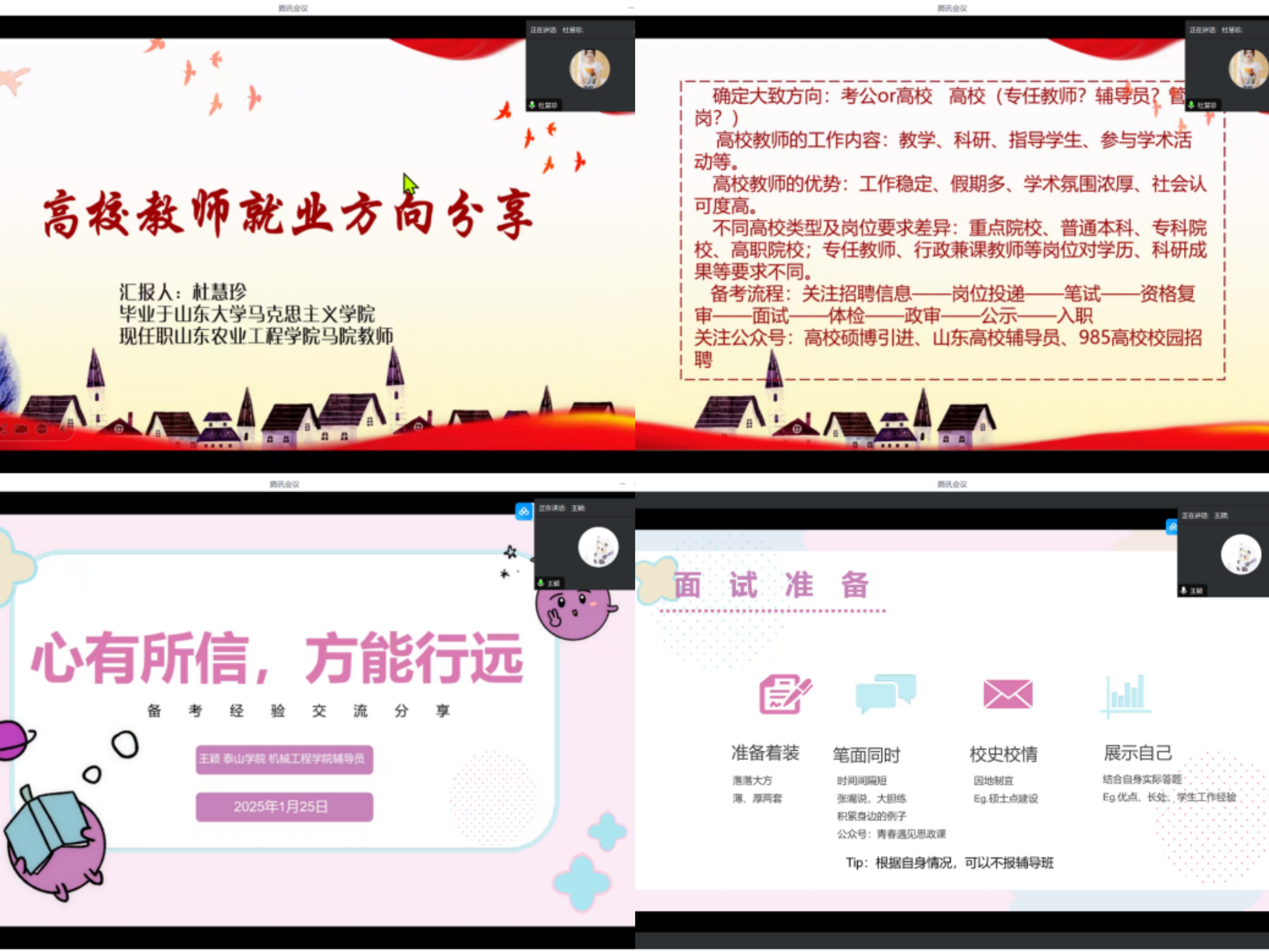 在山东农业工程学院太阳成集团tyc151cc任思政课教师的杜慧珍和在泰山学院任辅导员的王颖也分享了自己备考的经验。杜慧珍从高校教师职业解读、前期准备、笔试备考攻略、面试应对技巧和其他注意事项六个方面进行了分享,鼓励同学们要提前确定好自己的主要就业方向,进行有针对性的准备。王颖则结合自己的备考经历从备考时间、笔试内容、面试内容、备考经验四方面进行了分享,提出了学习时政、整合文件的建议,助力同学们更好地进行高校教师和辅导员的备考。