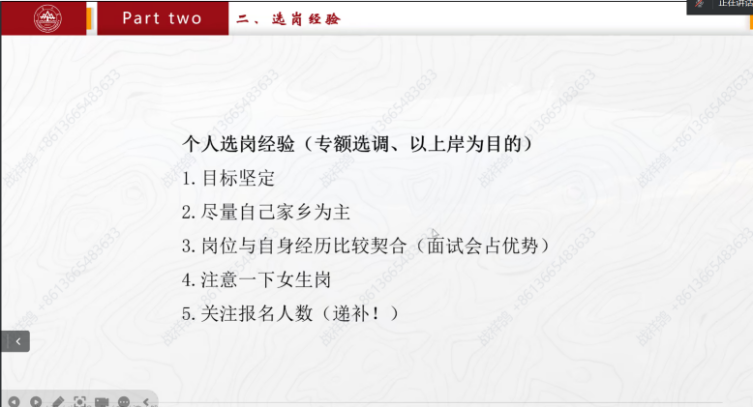 就职于淄博市退役军人事务局的张文金从考试时间和内容、选岗经验、复习经验等方面为大家全面讲解了专额选调的相关备考经验,他建议同学们在选调备考中要选择适合自己的岗位,让同学们对考试选择和备考重点有了更加清晰的认知。