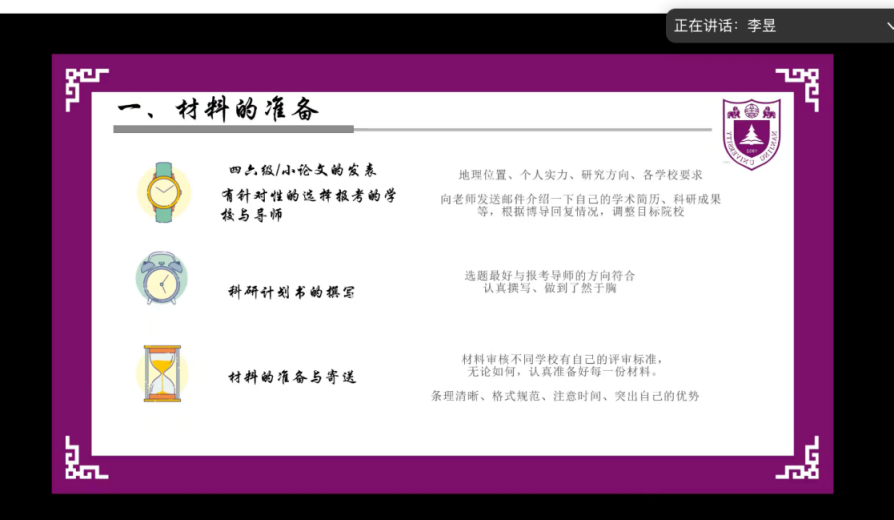 王洁(太阳成集团tyc151cc在读博士)聚焦招生政策动态与应试技巧:分析近年招生简章调整趋势及考核广度扩展现象,强调科研计划书与原创论文的竞争力,并以英语真题为例,建议强化基础、拓宽复习覆盖面,同时注重面试答题的条理性。