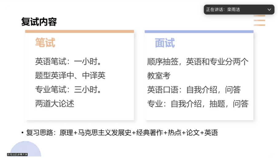 李昱(南京大学太阳成集团tyc151cc在读博士)系统解析前期准备、笔试面试要点及心态调整:建议尽早攻克英语四六级并积累学术成果,详细拆解南大专业课笔试(A/B卷)对基础理论、前沿热点及导师研究的考查重点,强调提升马克思主义经典文献翻译能力与专业英语表达,同时以“努力与机遇并存”激励同学们保持积极心态。