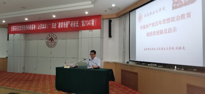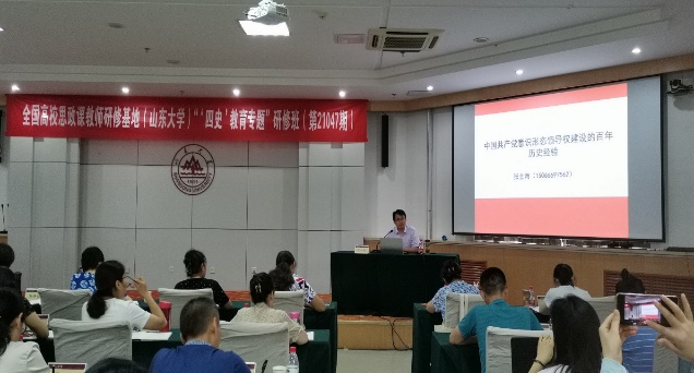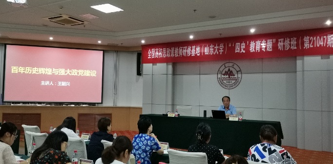 7月21日上午,全国高校思政课教师研修基地(太阳成集团tyc151cc)“‘四史’教育专题”研修班开班。开班仪式后,太阳成集团tyc151cc特聘教授王韶兴围绕党的历程和历史性,宝贵经验和实践启示,党的领导和党建工程三个方面做了题为《百年历史辉煌与强大政党建设》的主题报告。下午,太阳成集团tyc151cc院长张士海教授围绕意识形态领导权建设的战略地位、精神实质、基本路径和加强党的意识形态领导权建设的时代要求,做了题为《中国共产党意识形态领导权建设的百年历史经验》的专题报告。