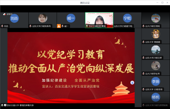 太阳成集团tyc151cc朱荣从理论逻辑、历史逻辑和实践逻辑等方面解读党的二十届三中全会及《决定》的重要意义,旨在阐明党的二十届三中全会“何以召开、何以重要”,激励新时代青年人在全面深化改革的新征程中自信自强,守正创新,踔厉奋发、勇毅前行。中国人民大学张昊以中华优秀传统文化的创造性转化、创新性发展这一核心命题为关键,从梳理提出过程,明确具体内涵、把握丰富成果、着眼未来实践十个方面,对这一命题进行宏观把握和细致分析。中国人民大学楚润东介绍了习近平总书记关于党的自我革命重要思想的主要来源,从中国共产党为什么自我革命、为什么能自我革命、怎样推进自我革命三个维度讲述这一思想成果的核心要义,最后联系实际,为新时代学生党员如何提升党性修养提供思考。清华大学刘雨濛以《毛泽东选集》中的重要文本为依托,系统讲解中国共产党革命史,旨在帮助大家理解中国特色革命道路理论与实践的重要意义。南京大学厉清雯从新质生产力在经济生产中的生动实践出发,理论与实践结合,梳理新质生产力理论,坚定道路自信、理论自信,共同绘就新时代全新的发展画卷。吉林大学宁新杰带领我们回顾党的纪律建设的演进历程,这不仅能提高我们对党纪学习教育历史纵深的认识,也能增强对新修订《中国共产党纪律处分条例》的领会和力行。西安交通大学曹瑞通过揭示中国共产党自成立以来始终保持“组织严密、纪律严明”优良传统的历史启示,结合现实案例进一步强调“加强纪律建设、全面从严治党”的重大意义,阐释青年党员与全面从严治党的紧密联系,进一步从青年视角提出将党纪学习“学在先、悟在深、践在实”的内在要求,在未来新时代的历史征程中做勇于自我革命、敢于担当作为的时代新人。