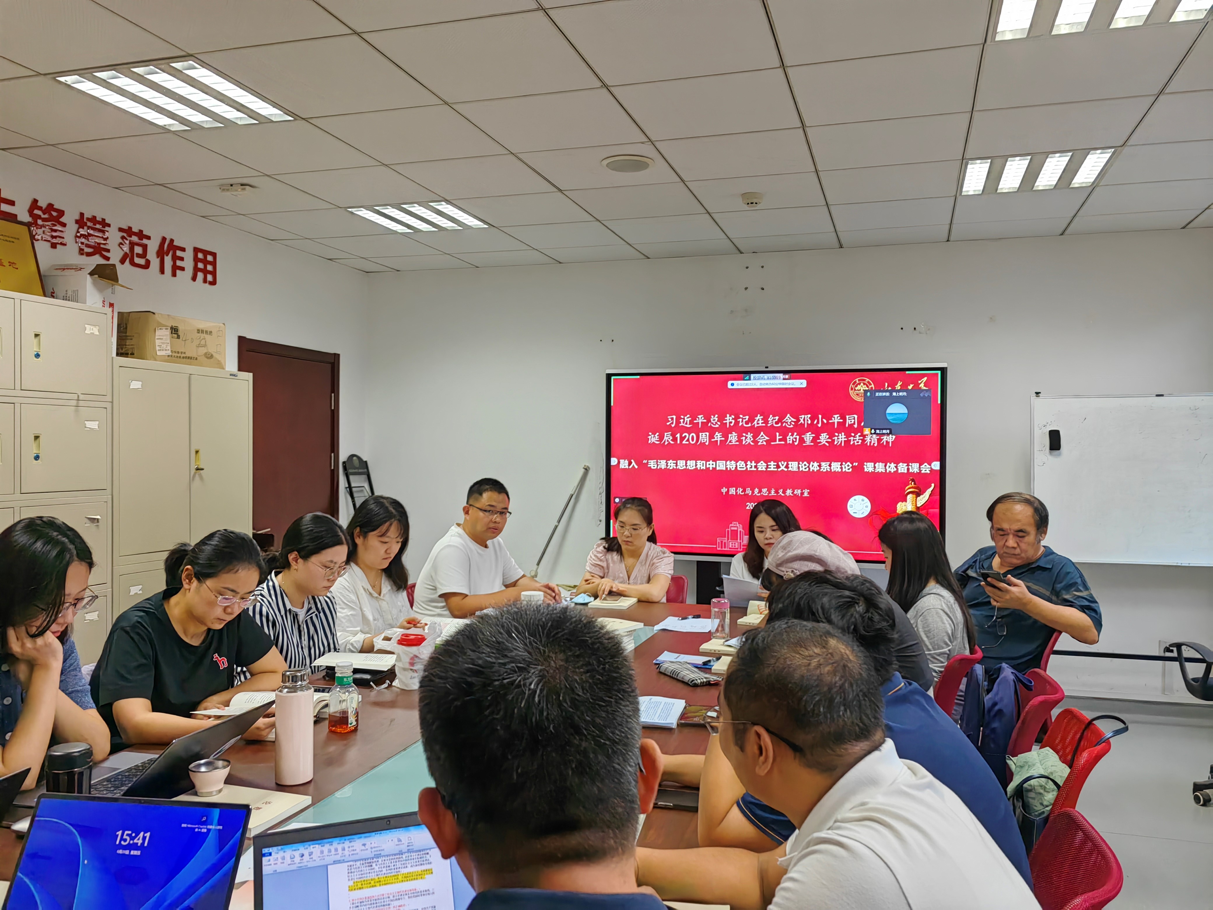 为坚持不懈用习近平新时代中国特色社会主义思想铸魂育人,将党的创新理论最新成果及时融入思政课教学,不断提高思政课的针对性和吸引力,着力打造学生真心喜爱、入脑入心的新时代思政课,近日,中国化马克思主义教研室组织开展“习近平总书记在纪念邓小平同志诞辰120周年座谈会上的重要讲话精神融入‘概论’课”集体备课会。教研室全体教师参加备课会,会议由教研室主任李磊主持。