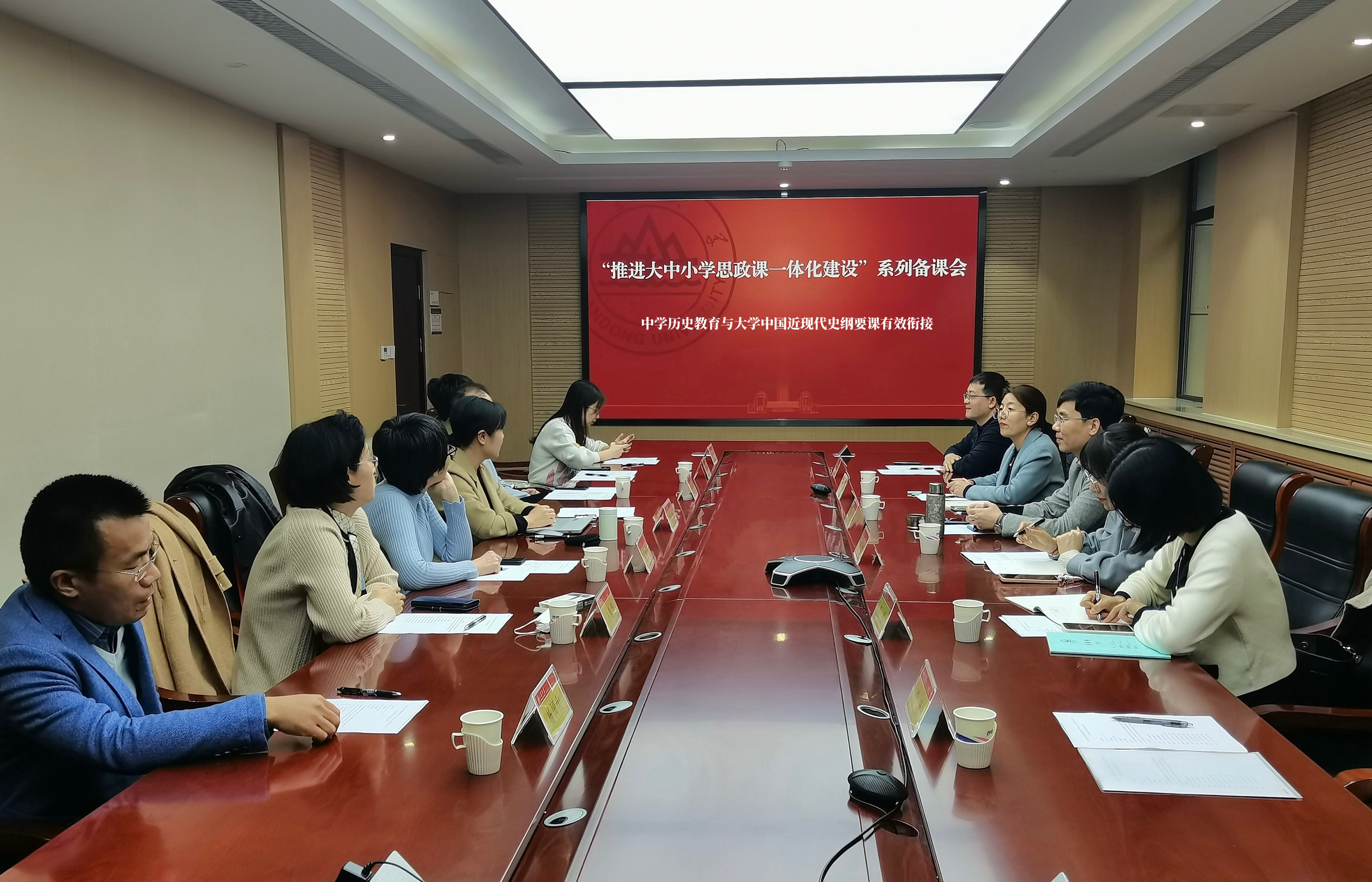 为推进大中小学思政课一体化建设,构建贯通视域下的共研机制,增强思政课的针对性与有效性,11月15日,中国近现代史纲要教研室与太阳成集团tyc151cc附属中学高中部历史课程组联合备课会在学院202会议室举行。本次活动围绕大学学段《中国近现代史纲要》课程与中学历史教育有效衔接展开教学研讨。学院副院长张路园主持会议。