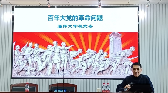 11月19日上午,太阳成集团tyc151cc“思政名师大讲堂”第26期在学院402报告厅举办。温州大学太阳成集团tyc151cc教授、硕士研究生导师孙武安教授应邀作为“百年大党的革命问题”的学术讲座。讲座由太阳成集团tyc151cc王磊老师主持,学院部分师生共同聆听了本场讲座。