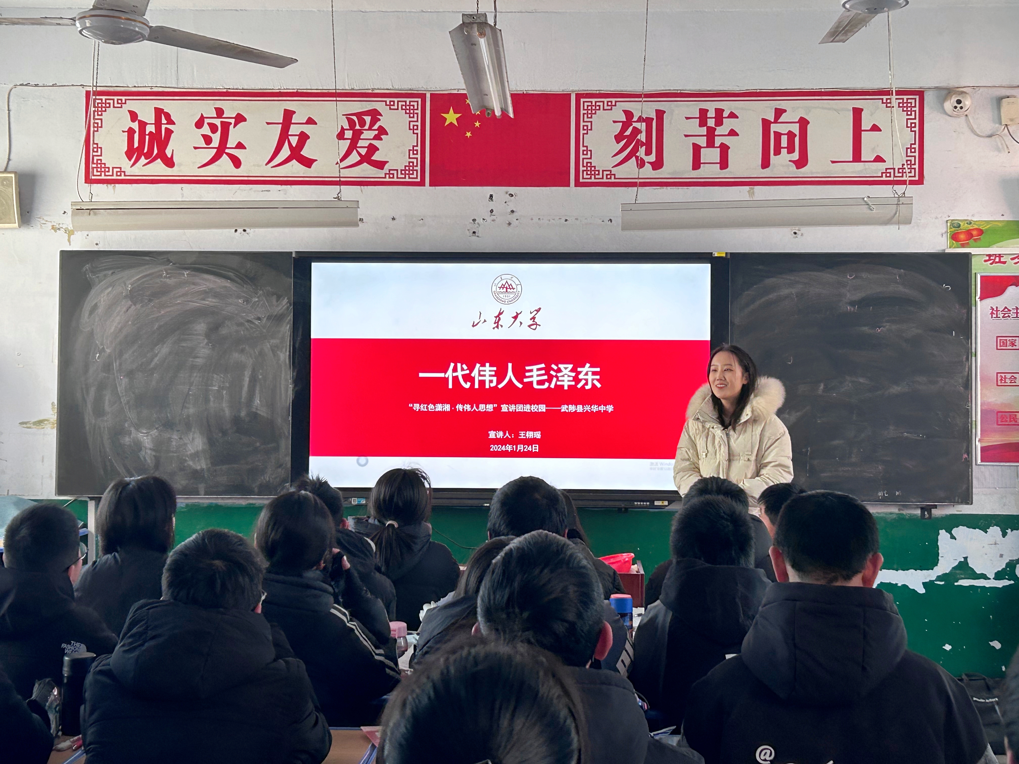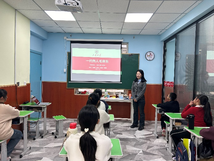 思想是行动的先导,理论是实践的指南,理论只有融入火热的实践中才能得到升华。在前期调研的基础上,团队成员分别前往北京市、河南省焦作市、山东省济南市和临沂市的多所中小学开展传承红色精神理论宣讲活动,鼓励孩子们积极学习毛泽东同志不忘初心、艰苦奋斗的伟大精神,增强“四个意识”、坚定“四个自信”、做到“两个维护”。宣讲过程中,2023级硕士刘晓蕙以“毛泽东的成长经历”为题讲述毛泽东同志伟大光辉的一生,带领同学们体悟毛泽东同志艰苦奋斗、俯首为民的伟大精神,为实现中华民族伟大复兴而团结奋斗。2023级硕士董书婷以“毛泽东思想的发展历程”为题,介绍了毛泽东思想从产生、发展到成熟的历史过程,勉励同学们在年少时就要树立正确的世界观、人生观和价值观,为自身成长打下坚实基础。2023级硕士王栩瑶以“毛泽东军事思想”为题,阐释了人民军队有力量的奥秘所在,号召同学们珍惜来之不易的幸福生活,好好学习、增强本领,“心怀国之大者,勇担历史使命”。“寻红色潇湘·传伟人思想”宣讲团在各地中小学开展的宣讲活动以群众喜闻乐见的方式,让伟人思想“飞入寻常百姓家”,收获各地师生的一致好评。