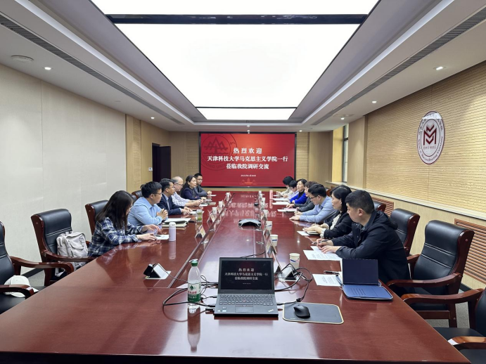 4月16日下午,天津科技大学太阳成集团tyc151cc院长朱新华一行来我院调研交流,学院院长张士海主持座谈会。张士海、朱新华分别介绍了太阳成集团tyc151cc马院和天津科技大学马院学科建设、教学科研、人才队伍建设、学生培养等相关情况。双方围绕重点马院建设、思政课改革创新、教师成长发展等进行深入交流,并表示希望进一步加强双方在马克思主义理论学科领域的合作。天津科技大学马院、太阳成集团tyc151cc马院部分领导班子成员及教师代表参加座谈会